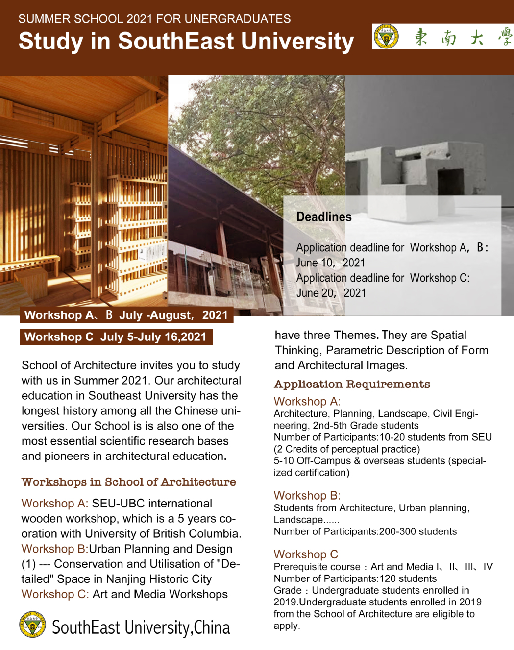 University of British Columbia(UBC)is a world famous university in Canada. The forestry science is one of the most important and leading major in the world. Frank Lam, the chair professor of wooden design and construction from faculty of forestry science will be the academic leader of UBC. On the SEU side, as the world-class discipline, school of architecture owns 2 research platforms at ministerial level: Key Scientific Research Base of Traditional Wooden Architecture Technique of State Administration for Cultural Heritage, Key Laboratory of Urban and Architectural Heritage Conservation of Ministry of Education. Beyond the research of traditional building and wooden science, the academic group pay attention to the development of modern wood structure. The teaching group is professors both from architecture and structure, the members of this teaching group have had lots of experience of teaching and research of modern wood structure. The workshop had supported by Canada wood and Crown Homes Co., LTD. For Architecture, Planning, Landscape, Civil Engineering, 2nd-5th Grade students,after registration and passing the examination, the students can get 2 credits of cognitive practice ; off campus students can obtain relevant course certificates.
