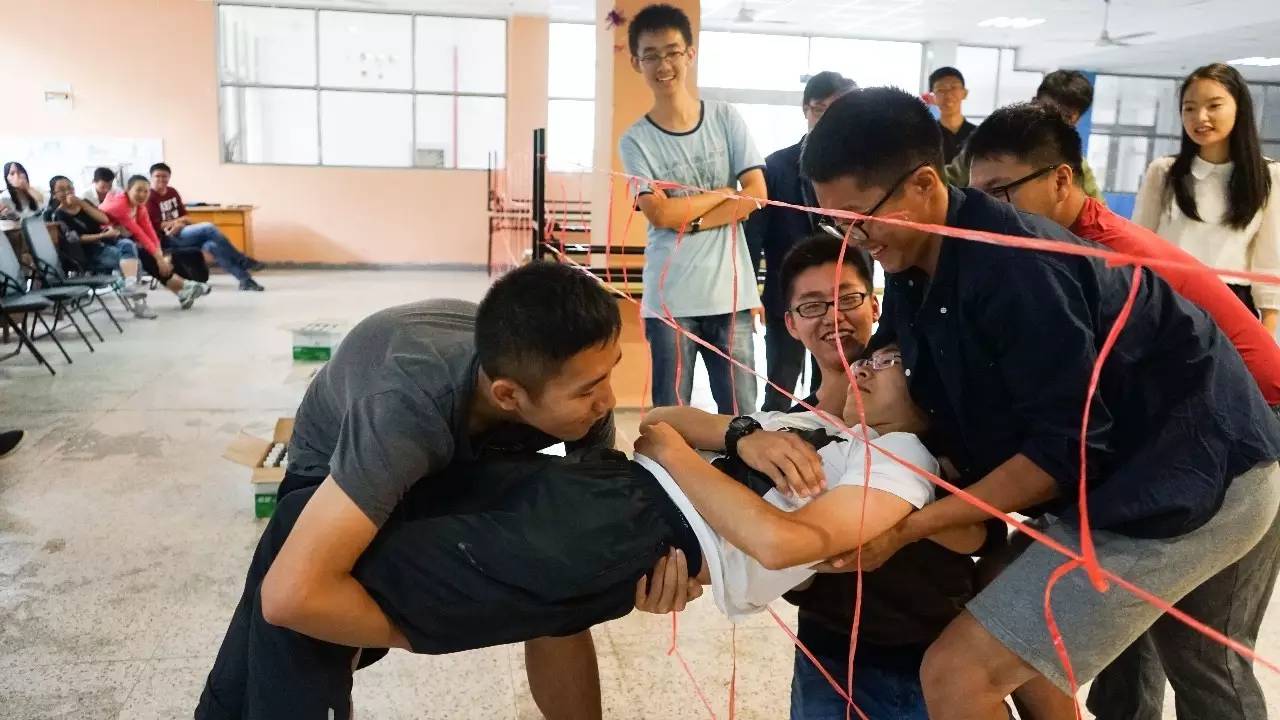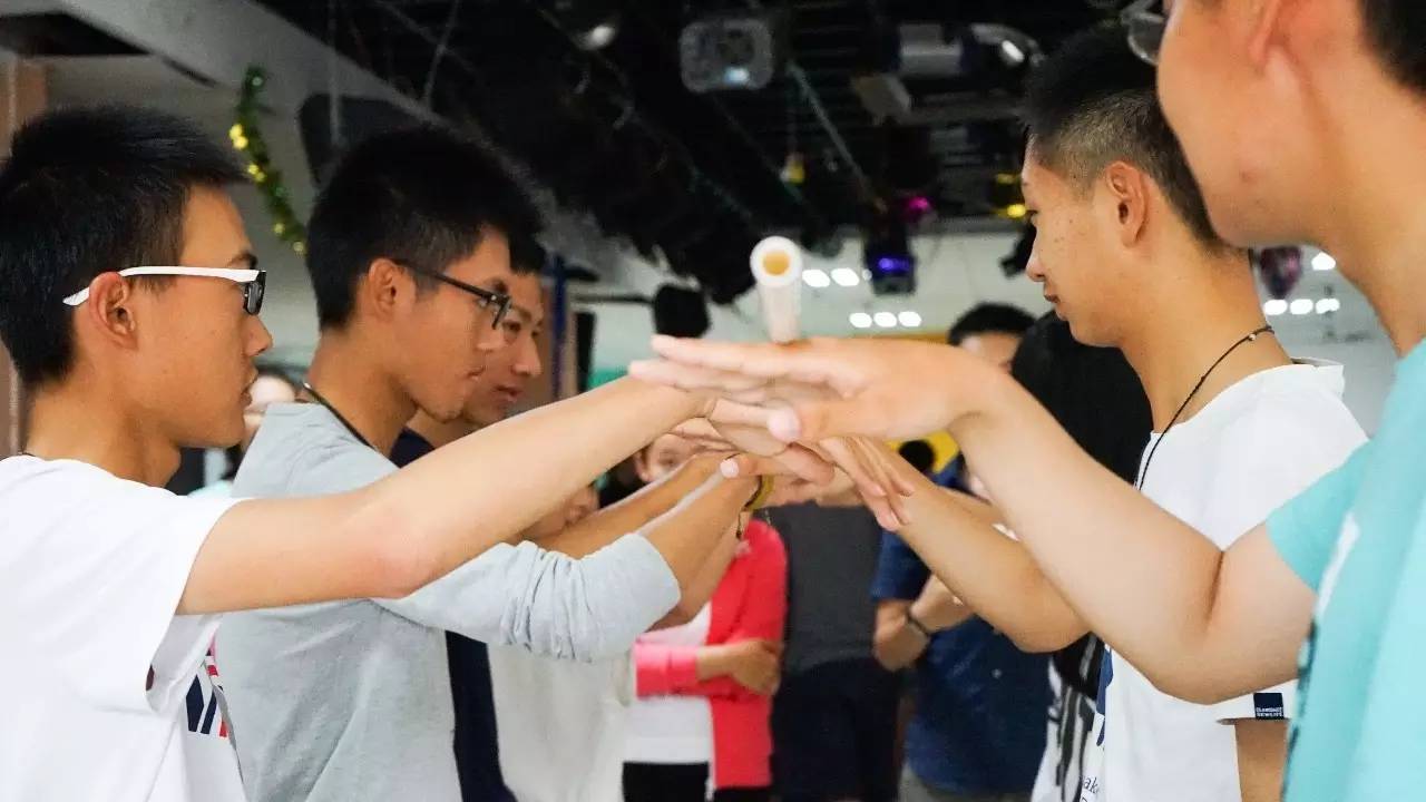 进入了分组活动的环节,第一个活动“齐眉棍”想要锻炼的是团队协调一致的能力,想要让这一根3米长的PVC管在八个人的手背上按照统一的速率下降,需要的不仅仅是团队合作这么简单,需要的是八个人真正地团结起来,向着这一个目标一起努力,不存其他杂念。