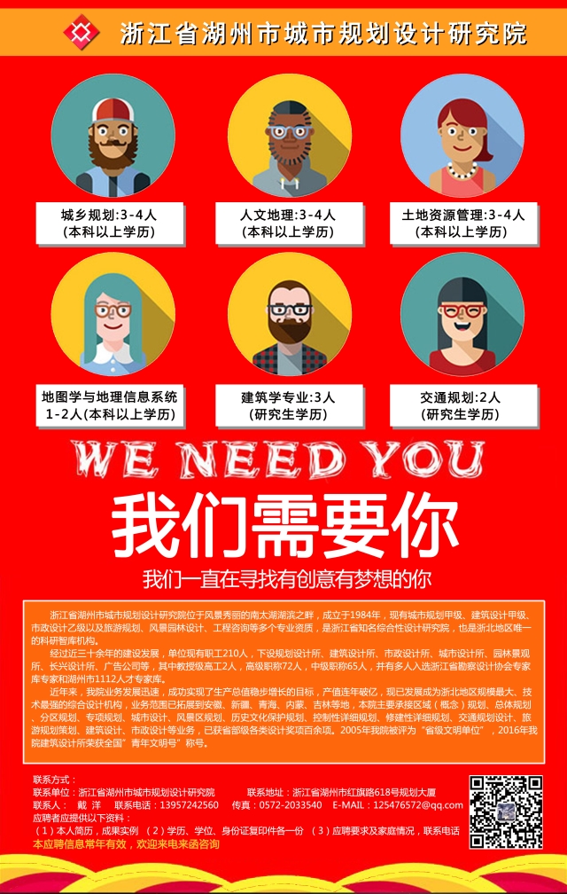 (岗位详细介绍或招聘简章) 湖州市城市规划设计研究院位于风景秀丽的南太湖湖滨之畔,成立于1984年现有城市规划甲级、建筑设计甲级、市政设计乙级以及旅游规划、风景园林设计、工程咨询等多个专业资质,是浙江省知名综合性设计研究院,也是浙北地区唯一的科研智库机构。 经过近三十余年的建设发展,单位现有职工210人,下设规划设计所、建筑设计所、市政设计所、城市设计所、园林景观所、长兴设计所、广告公司等,其中教授级高工2人,高级职称72人,中级职称65人,并有多人入选浙江省勘察设计协会专家库专家和湖州市1112人才专家库。 近年来,我院业务发展迅速,成功实现了生产总值稳步增长的目标,产值连年破亿,现已发展成为浙北地区规模最大、技术最强的综合设计机构,业务范围已拓展到安徽、新疆、青海、内蒙、吉林等地,本院主要承接区域(概念)规划、总体规划、分区规划、专项规划、城市设计、风景区规划、历史文化保护规划、控制性详细规划、修建性详细规划、交通规划设计、旅游规划策划、建筑设计、市政设计等业务,已获省部级各类设计奖项百余项。2005年我院被评为“省级文明单位。2016年我院建筑设计所荣获全国”青年文明号称号。 | |