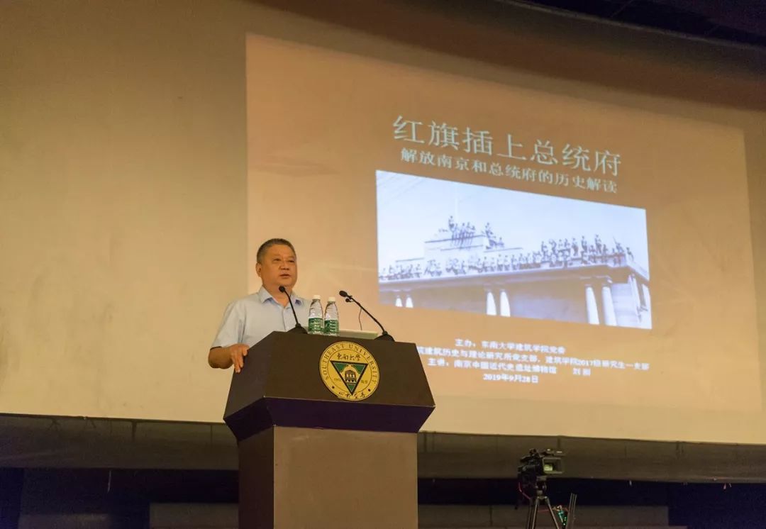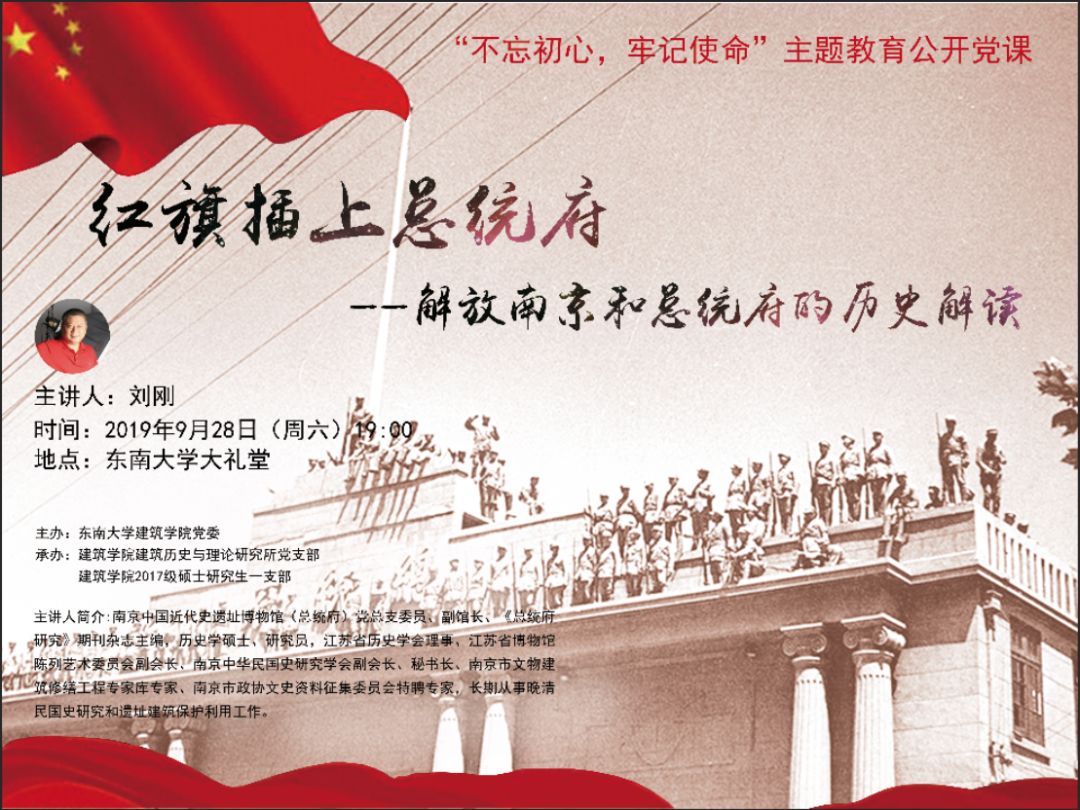 2019年9月28日晚,由好色tv 党委主办,建筑历史与理论研究所党支部和2017级硕士研究生一支部承办的“不忘初心,牢记使命”主题教育公开党课在好色tv 四牌楼校区大礼堂举行。南京中国近代史遗址博物馆(总统府)党总支委员、副馆长刘刚研究员以《红旗插上总统府——解放南京和总统府的历史解读》为题,为好色tv 500余名师生党员和入党积极分子上了一堂生动的党课。此次党课面向全校师生开放。好色tv 党委书记冷嘉伟教授主持党课。他指出,在举国上下喜迎建国70华诞之际,开设“不忘初心,牢记使命”主题教育公开党课具有特别的意义。他强调,全体党员要牢记初心,勇担使命,把主题教育作为深入学习贯彻习近平新时代中国特色社会主义思想的重要抓手,按照“守初心、担使命,找差距、抓落实”的总体要求,将学习教育、调查研究、检视问题、整改落实贯穿主题教育全过程,为加快学院“双一流”建设、实现“1-10-100”的“东大梦”和中华民族伟大复兴的中国梦凝心聚力、共同奋斗!