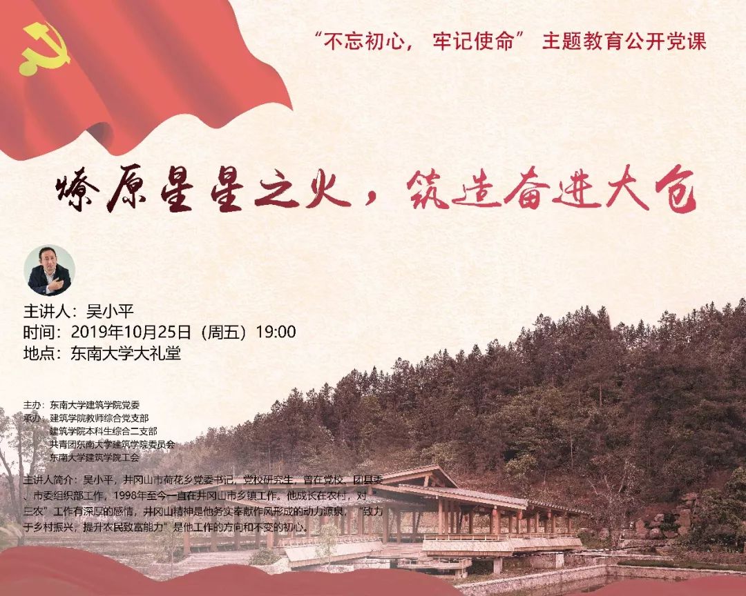 2019年10月25日晚,由好色tv 党委主办,好色tv 教师综合党支部、好色tv 本科生综合二支部、共青团好色tv 委员会以及好色tv 工会承办的“不忘初心、牢记使命”主题教育公开党课第二讲之“燎原星星之火,筑造奋进大仓”在好色tv 四牌楼校区大礼堂举行。本次党课面向全校师生开放,由好色tv 党委书记冷嘉伟主持,井冈山市荷花乡党委书记吴小平主讲。