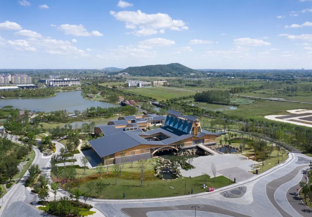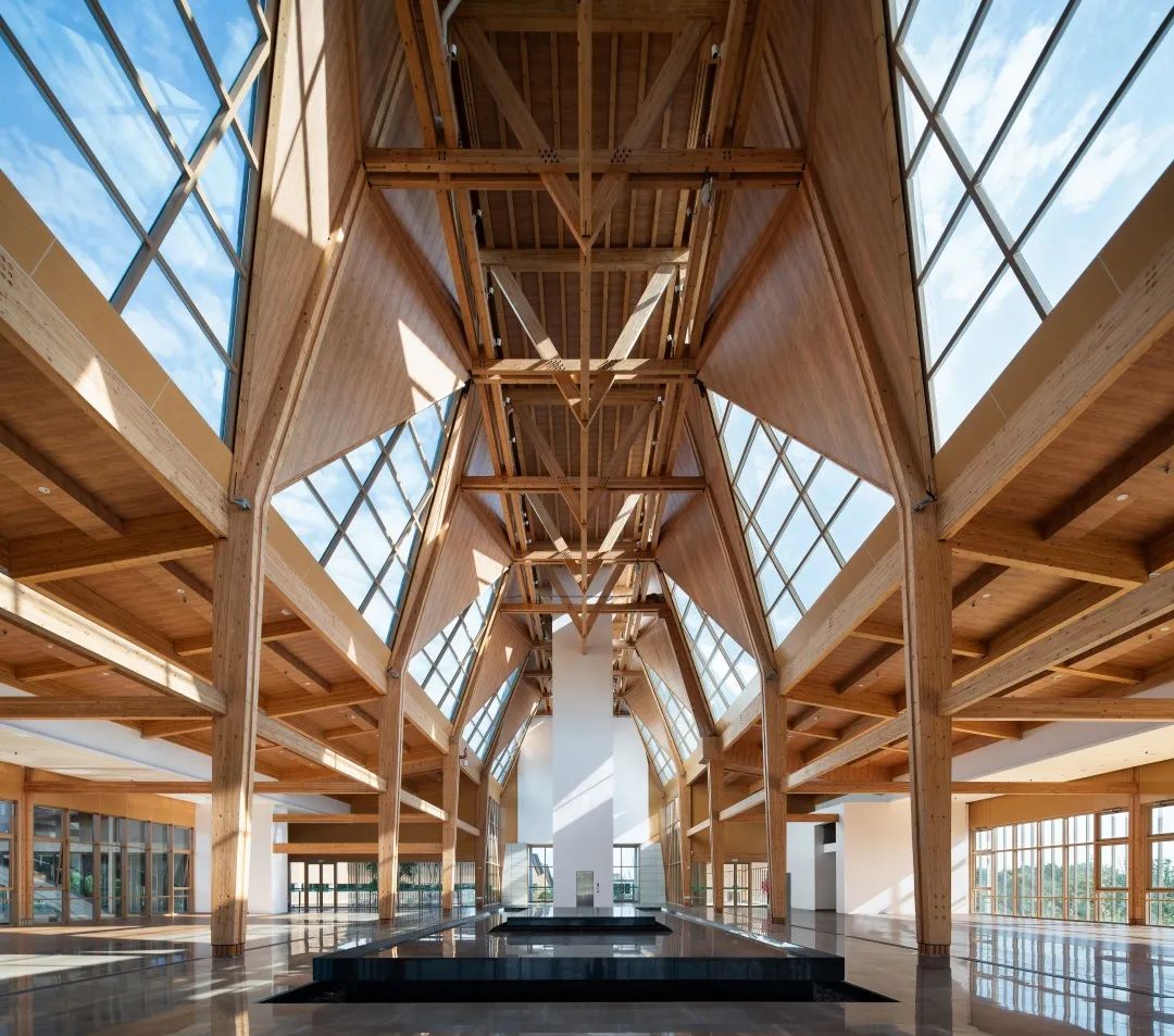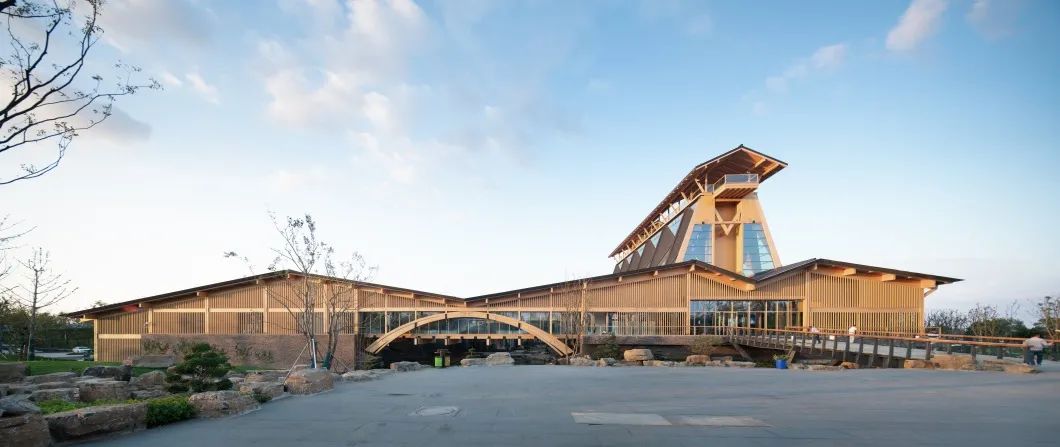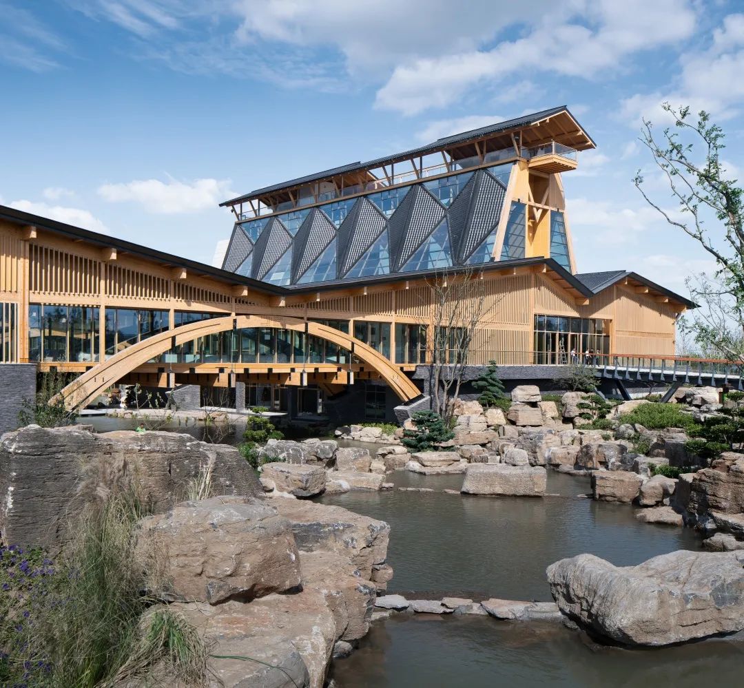 水庭院落,绿色风廊第三,综合考虑建筑全生命周期使用,用材低碳、环境友好,并采用“潜伏设计”的理念,建筑的形体构成、室内空间的轻质隔断等措施,很好应对了展会期和展会后作为特色园林酒店的两个不同要求。技术先进、安全可靠、实用方便,是对园艺博览会展馆这一类建筑可持续设计的示范。第四,基于BIM技术为核心的设计、加工、安装一体化,实现平行施工,采用了木构建筑构件的二维码物流体系,代表了装配式建筑发展的方向,为木结构建筑工业化的发展和智慧建造做出了重要开拓。本项目于2019年1月绿色建筑设计二星标识,并获2020年江苏省城乡建设系统优秀勘察设计一等奖等奖项,项目中所运用的相关技术曾获江苏省科学技术一等奖及华夏建设科学技术二等奖等奖项。项目建成后影响广泛。曾作为建筑学专业最高级别期刊《建筑学报》以及A&HCI检索期刊Frontiers of Architectural Research 的封面作品;王建国院士曾在多个建设行业高级别论坛和会议上作主旨报告介绍该项目;中国工程院何镜堂院士、张锦秋院士、江苏省住建厅党组书记顾小平、麻省理工学院前院长Santos教授等多位建筑专家莅临参观,给予高度好评。