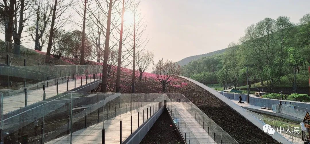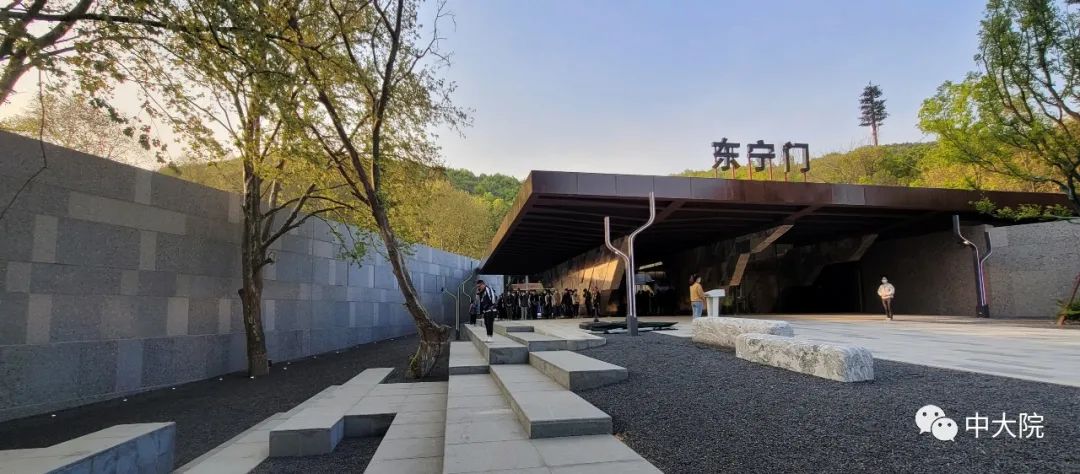 雒建利老师主持的是园博园2号入口北安门和3号入口东宁门。2号入口三面环山,有丰富的地质、乡村、工业、农田、矿区小铁路等诸多肌理和痕迹,设计顺应基本农田边界划出一道优美的“微笑曲线”,引导人流进入园区。3号入口位于园区东部丘陵起伏的山林之中,设计主题为“山水壁画,林中长廊”,沿原有道路设置一条石砌长墙,保留了基地内所有的大树。长墙同时也是一座人行天桥,连接了售票厅与小火车站,并可以直接通向自然山林,形成一幅巨型的山水壁画。