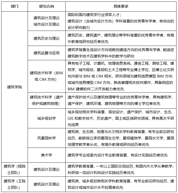 具有建筑学、城乡规划学、风景园林学博士学位,能从事建筑类相关专业的课程教学与科研工作;计算机或相关专业博士学位,能承担智能设计相关的课程教学与科研工作。