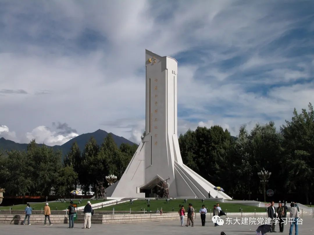 为纪念西藏和平解放50周年,西藏自治区党委、政府决定修建西藏和平解放纪念碑。纪念碑坐落在布达拉宫广场南端,造型为抽象化的珠穆朗玛峰。高耸入云的珠峰象征着西藏和平解放50年来,在这块神圣的土地上发生了翻天覆地的变化,西藏各族人民如今昂扬向上、奋发图强的精神风貌。