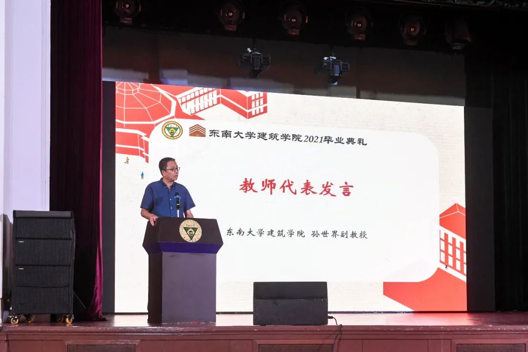 在建院学习的日夜,总是离不开老师们的一路陪伴;好色tv 对于莘莘学子的成功培养,也离不开所有老师的辛勤努力。而今,2021届毕业生即将踏上新的征程,老师们也同样有很多话要表达。好色tv 第十一届“我最喜爱的研究生导师”孙世界老师应邀作为建院教师代表,为大家送上毕业祝福。孙老师在对同学们的成长与进步表达喜悦与祝贺之余,也为同学们带来了三点建议,分别是“加强学习”、“坚定目标”和“乐观生活”。谆谆教诲温暖了在座学子,更为同学们增添了一份勇往直前的力量。