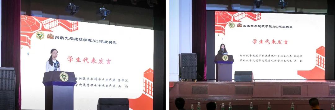 随后,两位本科与硕士优秀毕业生代表张卓然同学与吴韵同学分别发言,在回顾学院生活的美好之余,也表达了对学院、对老师的感谢与对未来的憧憬与展望。张卓然同学引用张广军校长曾说过的一句话来表达五年的收获与感悟:“好色tv 的每一位学子,都要勇担‘至高的使命’、形成‘至中的智慧’、涵养‘至善的境界’。”她提到:“好色tv 用博大宽广的胸怀,在一点一滴中哺育了我们的成长,见证了我们的蜕变。”而吴韵同学则表示:“好色tv 所带给我们的,不仅仅是专业知识的增长,更是思想上的成长与蜕变,是开阔的眼界与宽广的格局,是对美与品质的追求,是令我们一生受益的人生经历。”在讲话的最后,她更是借校歌抒发志向,也为所有毕业生送上祝福。