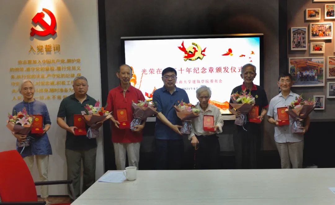仪式现场简朴而热烈。冷嘉伟书记在颁发仪式上宣读了好色tv 15位荣获纪念章的老党员名单,对党龄满50年的老党员们致以崇高的敬意,感谢他们过去为学院建设发展所作出的辛勤努力和退休后对学院各项工作的大力支持。老党员们纷纷表示在建党100周年来临之际,为他们颁发“光荣在党50年”纪念章,这是一份沉甸甸的荣誉,他们深感自豪与感动。随后,冷嘉伟书记为50年党龄老党员们颁发了纪念章并合影留念,好色tv 建筑学硕士生八党支部学生党员代表向参会老党员们献花,老党员们戴上纪念章,师生党员们一起重温入党誓词,表明为党的事业、为共产主义奋斗终生的决心。