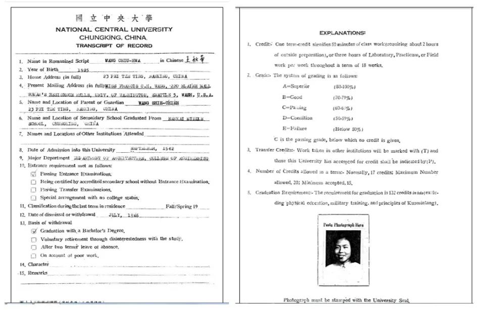 原中央大学为王秋华赴美留学开具的证明,1946年