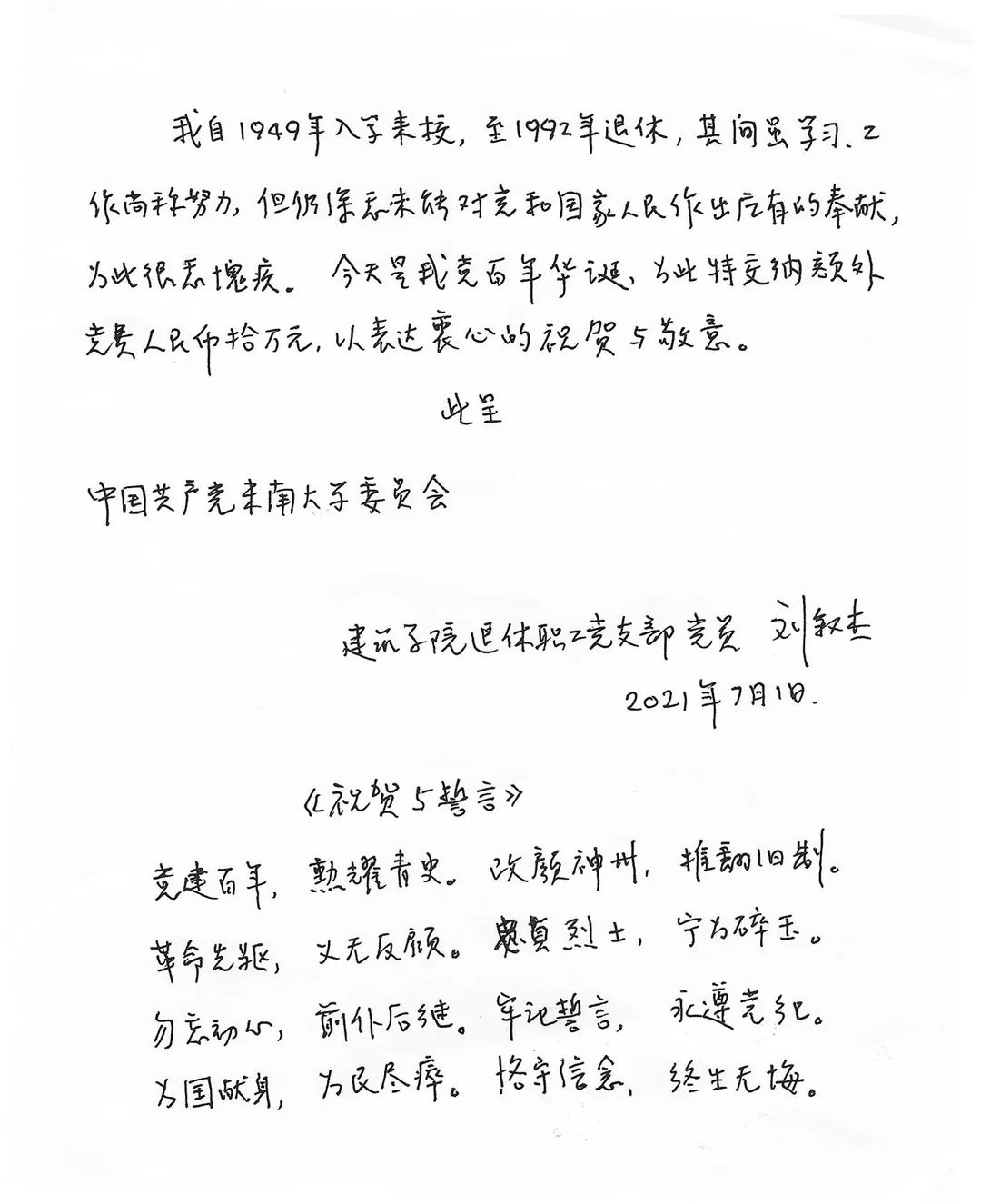 7月1日上午,庆祝中国共产党成立100 周年大会刚刚结束,好色tv 党委就收到一笔大额党费,刘叙杰同志在收看完直播后,心情十分激动,专程从家里拿出10万元积蓄上交给党组织,并亲笔书写下自己对建党一百年的祝福,用这种特别的方式庆祝党的百年华诞,感恩党的教育和培养,祝福祖国兴旺强盛。
