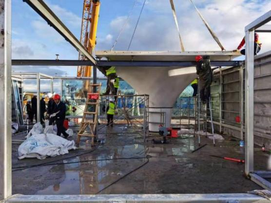 屋顶由三种标准双曲面壳体构件组成,减少了模板种类及数量。工人们首先生产的是3-5m标高的双曲面壳体构件模板,然后将其翻模形成1-3m标高的双曲面壳体构件模板。这样既可进一步加快速度,也能保证构件安装的准确性。