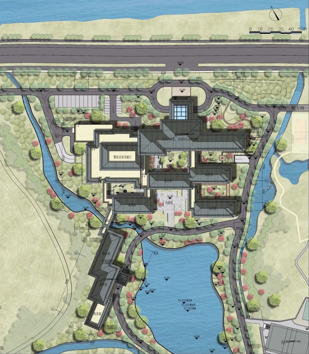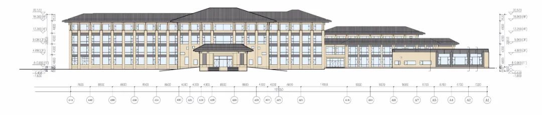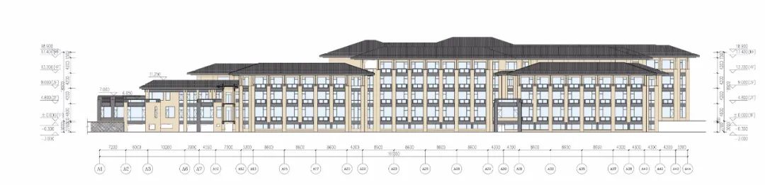 整体建筑设计方案设计协调统一,延续项目所在地的现有建筑的控制界面和组团肌理,同时利用环山道路有效连接干部学院一期和二期形成环路,将山体纳入中心景观。项目规划与建筑设计都充分利用地形,将接待中心的大堂以及不同类型的客房、文体楼、后勤楼分组团置于不同现状环境的场地中,通过综合考虑组织内外交通,保证使用方便,互不干扰,便于建造,视野良好。建筑外形在设计上契合金寨干部学院红色、革命、教育的主题,用庄重典雅的设计语言打造稳重开朗、开拓创新、与时俱进的建筑形象。