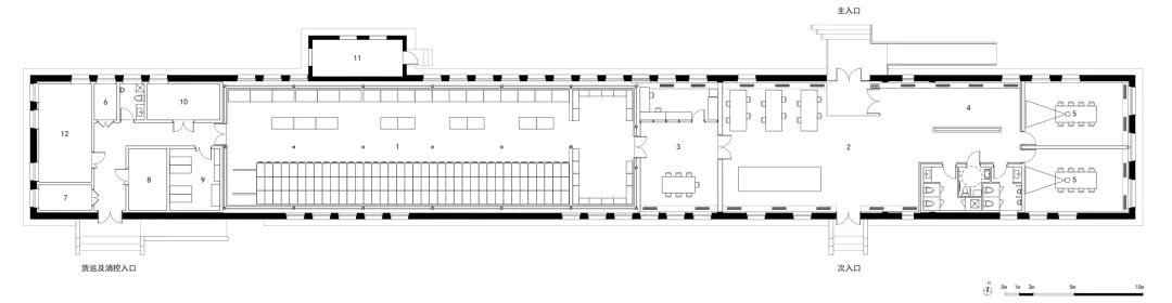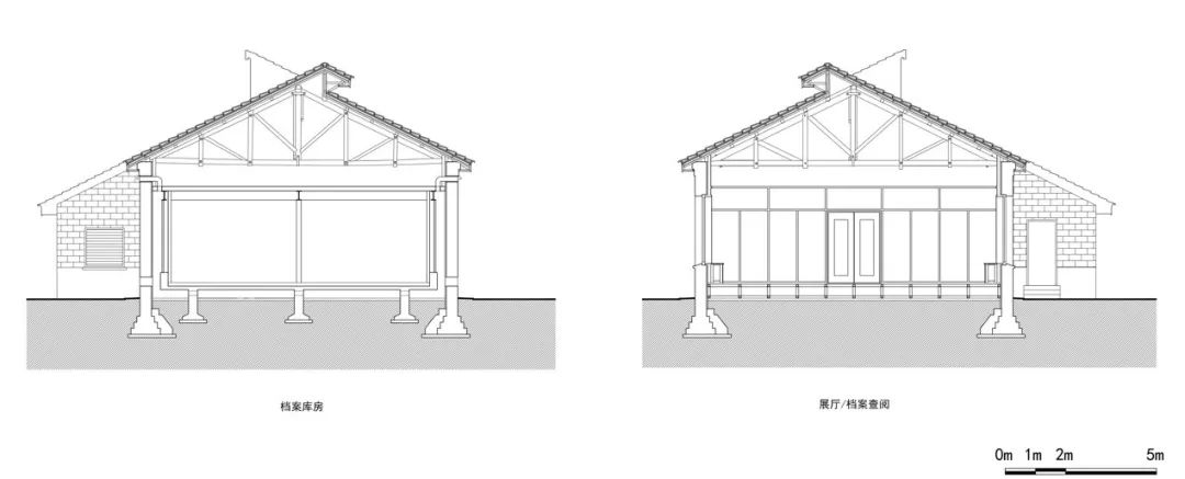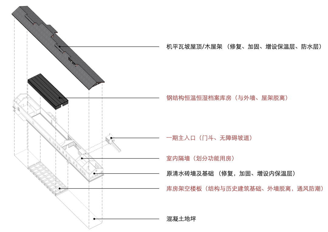 该建筑位于全国重点文物保护单位的建设控制地带范围内,必须遵循历史建筑保护与改造原则,项目组为此提出了“最小干预、历史复原、活化再生”的改造策略;在保持“侧平房”现有风貌和体量的前提下,进行结构加固和建筑修缮;对室内进行适度改造和性能提升以满足新的使用要求,通过架空地板达到灵活铺设管线和防水、防潮的目的。改造后的建筑容纳了档案中心的基本功能:档案库房、档案查阅、办公研究用房、文献研究与技术处理用房以及设备用房等。