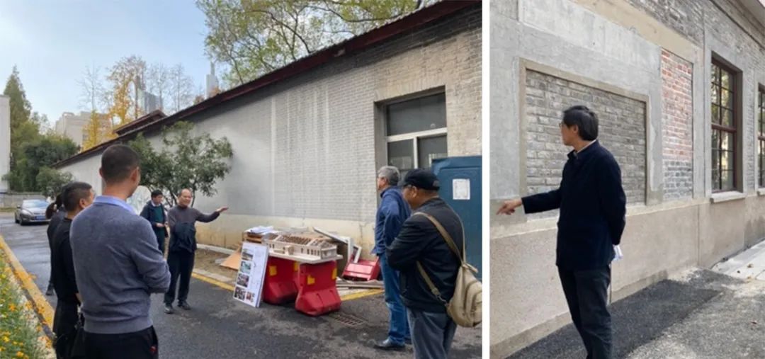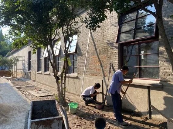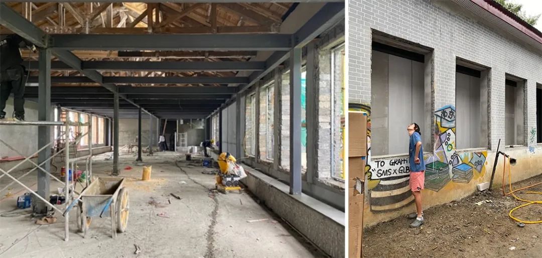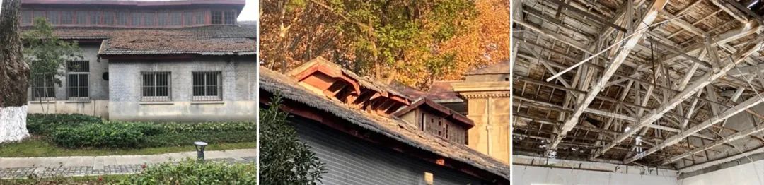 1. 修缮保护建筑的清水外墙、平瓦铺作、门窗和开洞等作为可阅读的“历史信息”被精心修缮、复原,以维续校园的历史风貌。而在“表象”之中,团队则通过结构、构造和设备等手段提升建筑物的稳固与耐久性、保温、隔热、防潮、控温等物理性能。清水砖墙内侧加设钢筋网水泥砂浆面层以增加墙体总体强度,继而增设保温层、防护层,而防护层亦为室内装修面层,经济与美观可一举两得。屋顶整体落瓦后,增设保温层和卷材防水,并挑选未破损瓦片和收购同类型瓦片经过尺寸和色彩比对、搭配,再次铺设(老房子为战时配套用房、等级不高,因此当初用材不甚讲究、尺寸不一)。修缮保护团队通过测绘、扫描等手段对老房子进行诊断,提出详尽的修缮措施,并在施工过程中采用随拆随查随修的方式对墙身、屋架、屋顶做出如“外科手术”一般要求精度和耐心的工作;设计团队和学院老师常常聚在工地,现场研究材质、色彩搭配与构造做法,与施工人员讨论工序和工法,工地俨然成为校园内的实践课堂。