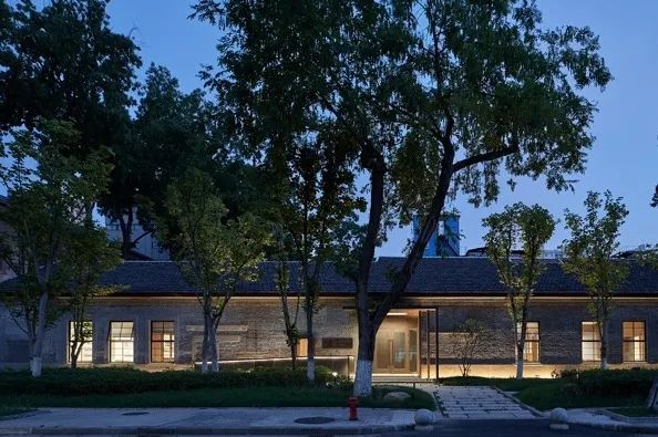 4. 门户——开放与衔接今天,建筑依旧保持着侧平房曾经的低调姿态,但一个敞口的紫铜门斗彰显出其不容忽视的作为重要学术机构的身份。深棕色的紫铜在背阴处泛着光泽,门斗的体量从内向外伸展,朝向南高院逐层张开的侧壁划开光线,接上一段曲折路径、避开门前的老树,经过尘封的古井——建筑、花木、古井被有机地重新组织起来。