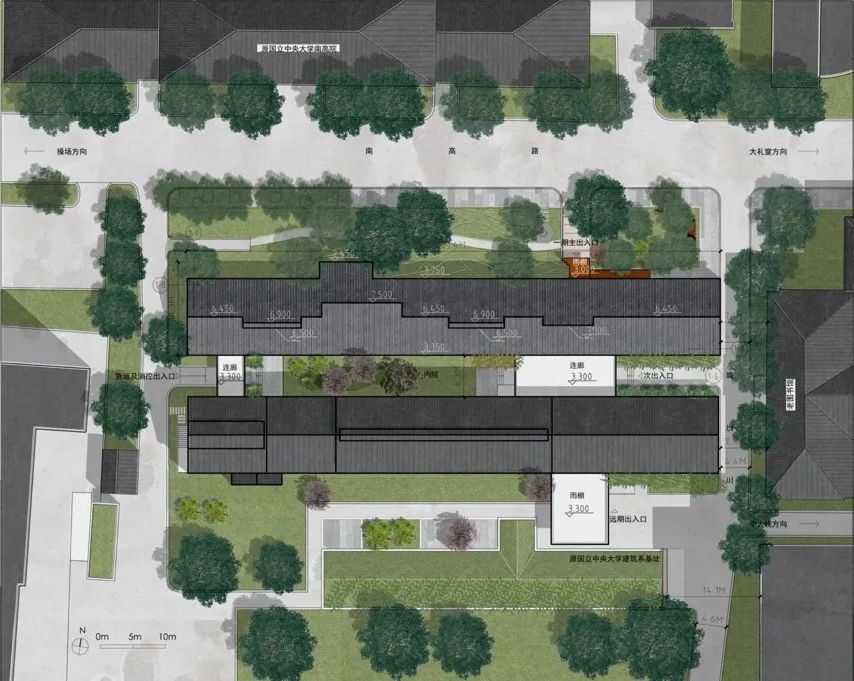 一期建设对象仅为侧平房最北侧的一幢沿路建筑,但考虑到未来学校对该组历史建筑的整体利用,将老图书馆西侧这组建于同时期的三栋建筑作为一个整体,在总体布局上统一规划,通过连廊将北侧现存的两排建筑进行连接,以符合档案中心今后的扩展要求。改造后,建筑主入口位于南高路上,成为亚洲建筑档案中心在校园内主干道上的形象展示。远期考虑将北侧主入口作为次入口,另在第二排建筑南侧设置主入口,面向并呼应老图书馆前小广场,进一步跨越中央大道而与中大院连为一体。经改造,北侧玉兰园与建筑的关系更为协调,在保留高大乔木的前提下,重新整饬了主入口东北角的植被。沿南高路的自行车棚被拆除,且档案中心前沿路不再允许停放机动车辆,极大地改善了档案中心的周边环境,其北侧的玉兰园也呈现出更为疏朗宜人的效果。