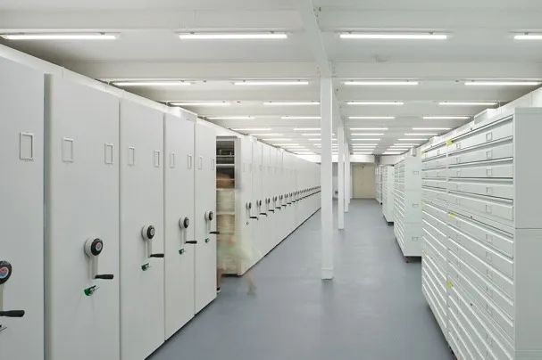 2. 抬地与房中房——建筑与收藏的双保护改造前的建筑室内外地坪几无高差,西北一端的散水已经出现低于建筑外景观面的状况,地面返潮问题严重,受潮霉烂的架空地板已局部塌陷。倘若联想前些年暴雨时校区的内涝,针对防水防潮的改造可谓当务之急。为此,在原有建筑内部,整体置入一个独立的钢结构库房,其钢筋混凝土基础采用特别设计:其井格地梁将库房地坪抬高至室外地面以上50公分处,楼板的板边上翻以求进一步预防水侵。在混凝土地梁上的开洞使各个梁仓相互贯通,以便通风、除湿。建筑在库房段所处的南北外墙上设置通风口,让空气在墙体之间和基础架空层内形成对流。安装在上方通风口的电动排气扇则能够进一步加强通风、排湿的效果,降低设备除湿的负担,降低能耗。库房东西两侧的室内地坪也随之抬高,而这部分地板结构使用了截面较小的方钢骨架,满铺置于混凝土基层上,架空地板的构造空间用于空调等管线的铺设。