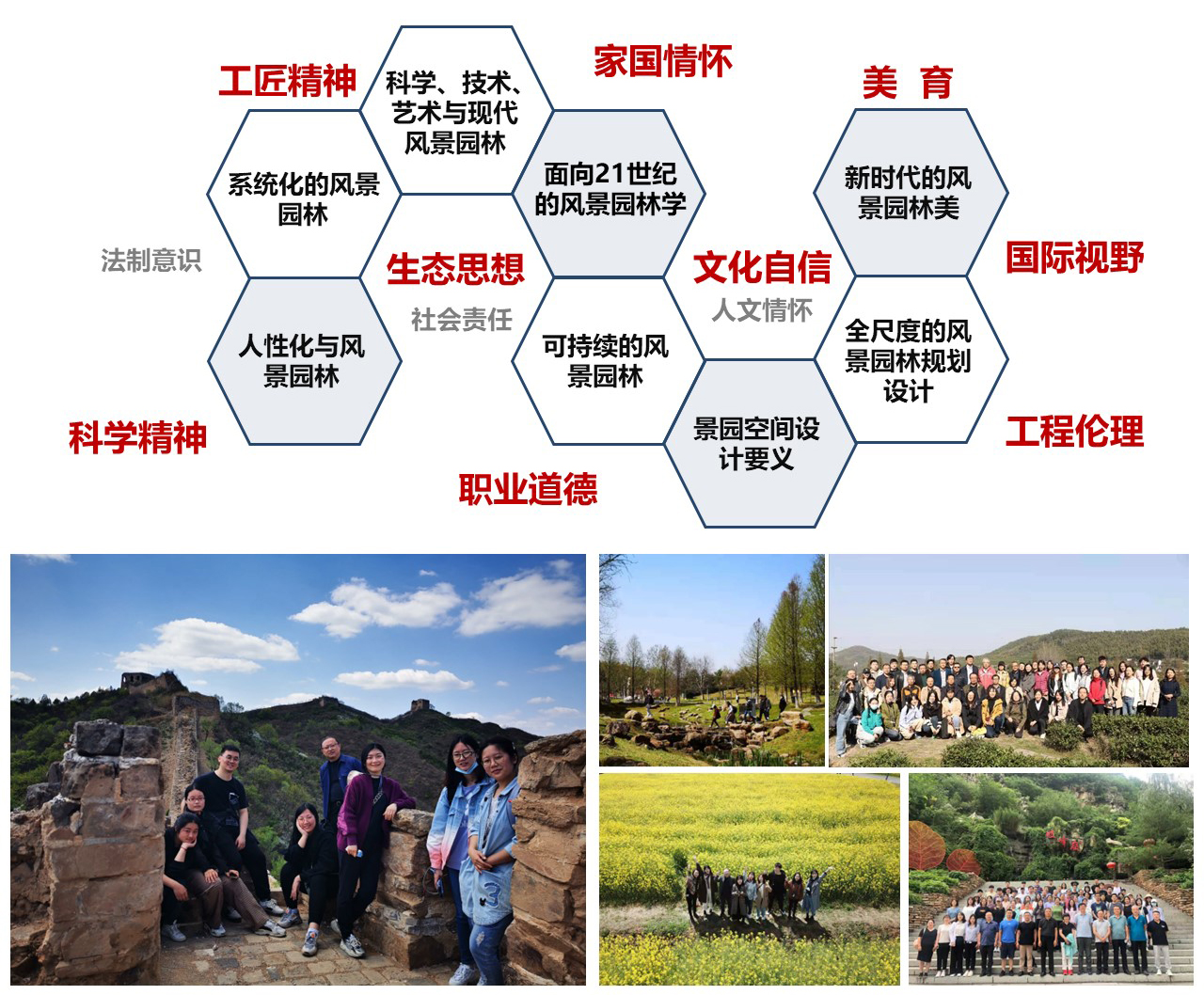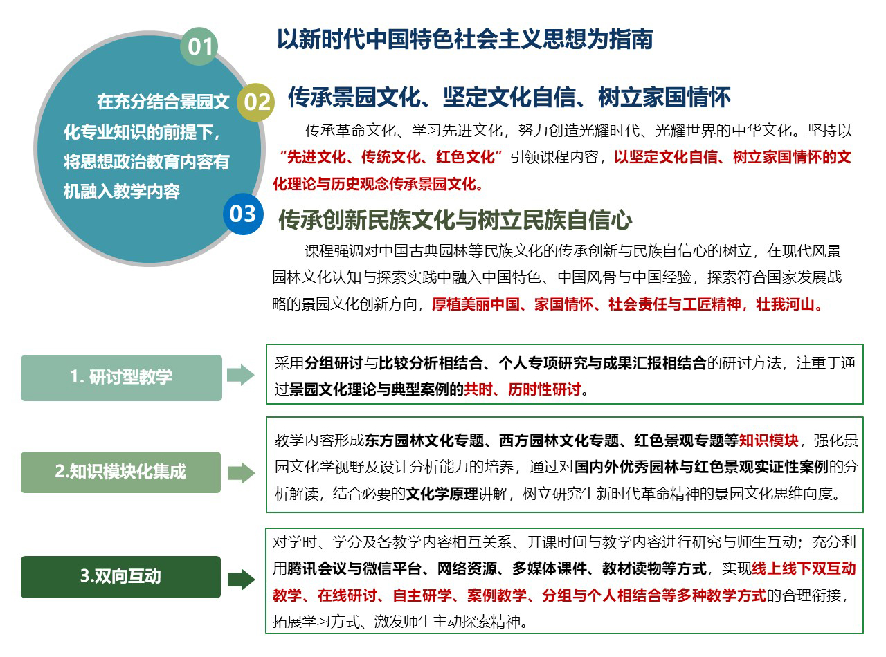 课程坚持以国际视野、中国特色、前沿意识的风景园林文化理论与研究方法引领课程内容,以坚持民族自信、家国情怀的历史理论与遗产保护研究传承景园文化,以世界优秀景园案例与文化景观解析强化思想阵地与教学优势。教学内容围绕价值塑造、能力培养、知识传授三位一体的课程建设目标,筑牢知识模块与家国情怀、文化自信、人文关怀、工程伦理、工匠精神等社会核心价值观文化元素的“触点”和“融点”,强化典型案例的教学运用。课程结合景观文化理论基础讲授,梳理当代景观文化研究体系,厘清景观设计中文化观念的动态变迁与发展趋势,深入解析当代景观设计思潮与应对策略,促进学生主动运用景观文化学的理论角度进行具体分析与实践;通过景观设计历史与人文思潮的共时性比照分析,梳理景观文化发展历史进程与文化规律,进而把握风景园林设计中应用人文思维进行设计的基本原则、方法和技术;通过一定的国内外景观设计典例研究,结合必要的文献阅读与实践调研,使学生充实分析能力,强化设计能力,扩充景园知识体系。课程获2021年好色tv 研究生课程思政示范课程建设项目立项并获评“优秀”,相关教学内容纳入2021年教育部“主题案例”并于全国高校思想政治工作网“育人号”报道。
