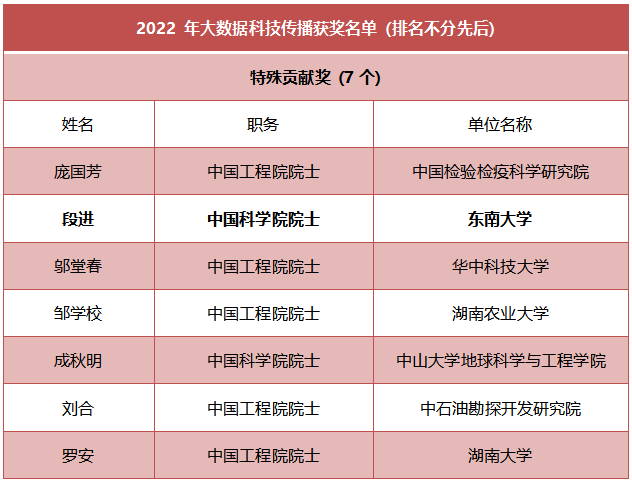 "大数据科技传播奖"是中国科技新闻学会在2018年首次设立的奖项,旨在表彰在大数据科技应用、传播和推广事业中做出卓越贡献的团体和个人。2022年大数据科技传播奖评选活动由中国科技新闻学会、湖南省科协、衡阳市人民政府联合开展,经郭华东、李兰娟、褚君浩等院士担纲的大数据科技传播奖评审委员会严格评选审定,评出特殊贡献奖 7名,作品奖9件,团体奖13个,个人奖28名。
