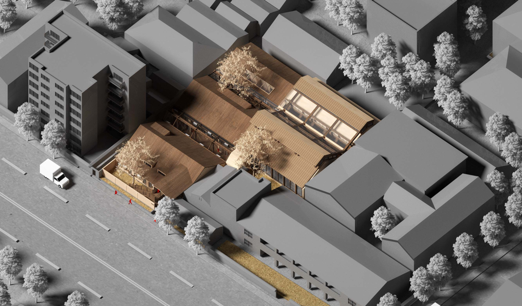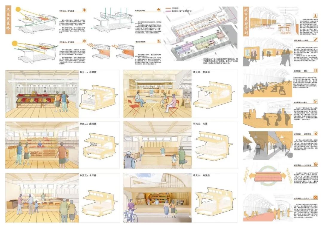 本次竞赛作品选址豆菜桥菜市场,地处南京城市中心,新街口区域,是城市由闹转静、由商办功能转文教居住功能的转折点。对于这座城市来说这个转折点的现状过于“普通”,缺乏一种可唤起城市记忆的城市意向,因此在设计中,团队试图在这个特殊的转折点处挖掘菜市场这一城市要素被塑造的可能性。设计基于模块化木构的基础策略将豆菜桥菜市场拓展成为一个城市公共展廊,挖掘菜市场的买卖交易中仪式感,发现其公共空间中的潜力,让普通的生活亦可在“舞台”上被展出。