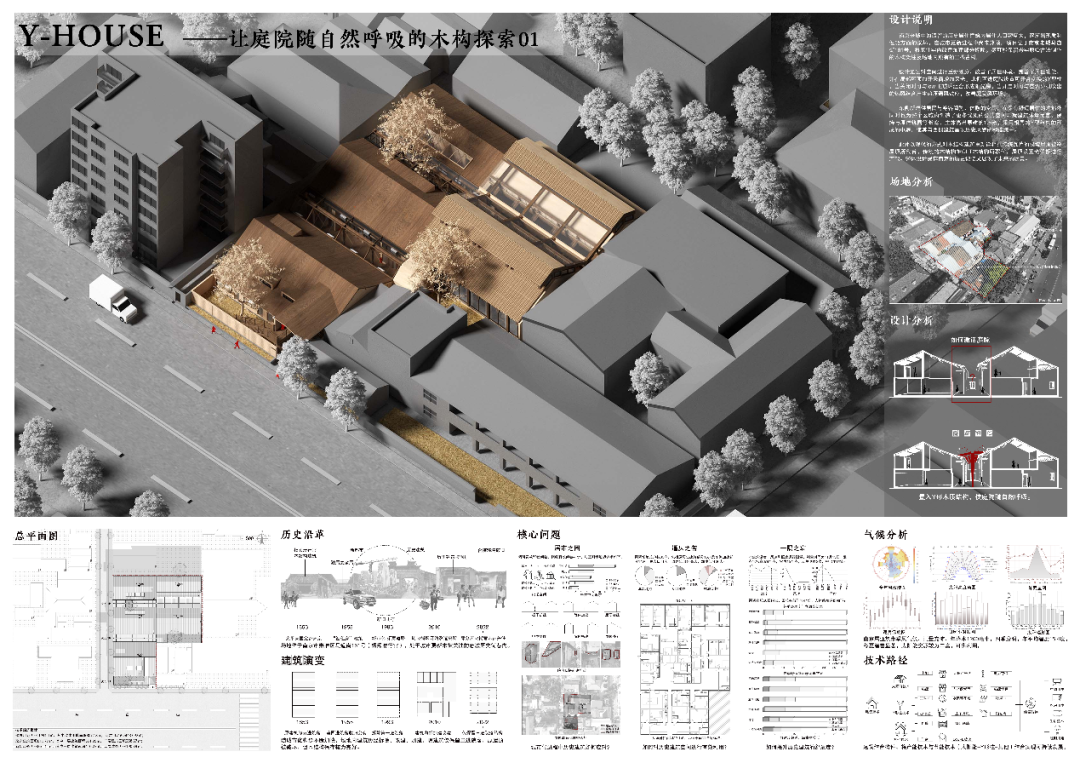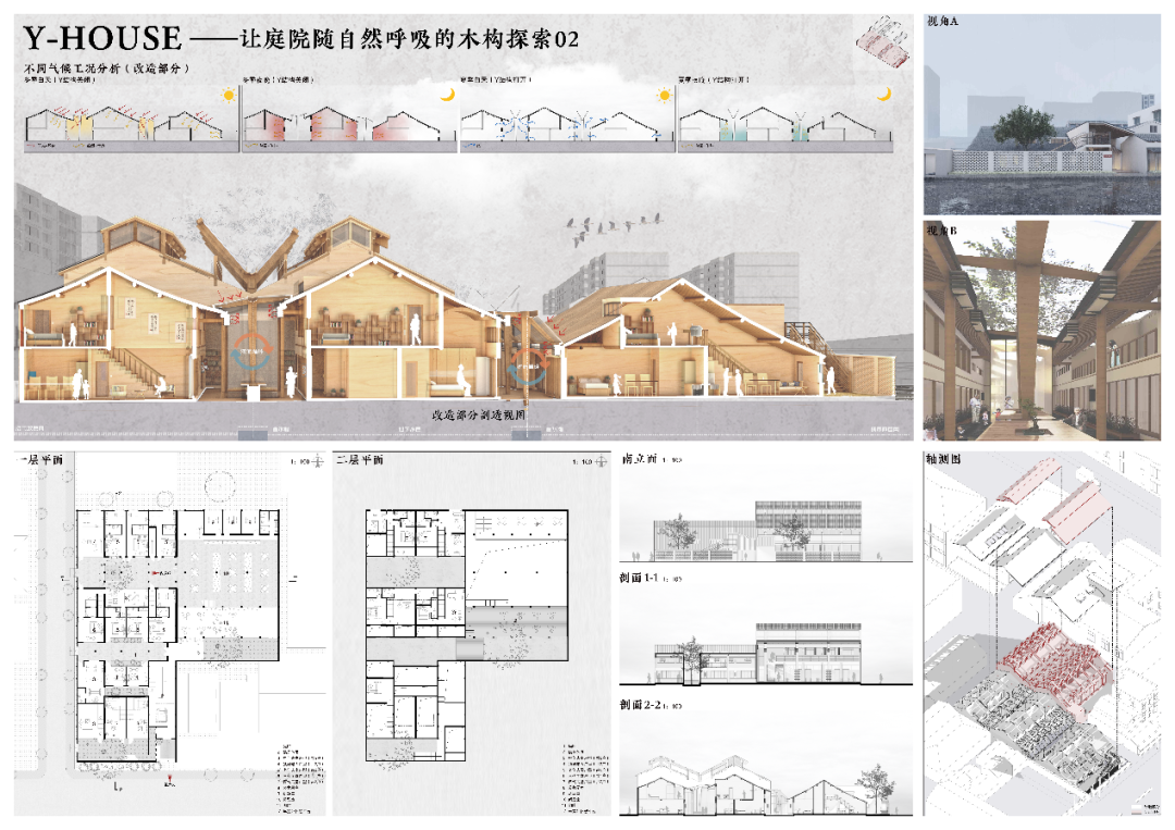 2023年3月7日,“有机更新,低碳木构 | 2022年第二届绿色建筑竞赛” 颁奖典礼在成都举行。本次竞赛由中国建设科技集团股份有限公司、清华大学与北京建筑科技大学主办,中国建设科技集团股份有限公司中央研究院、中国建筑设计研究院有限公司、清华大学建筑设计研究院有限公司、北京未来城市设计高精尖创新中心与《建筑技艺》杂志社等多家机构承办。评委会主任由中国工程院院士,中国建科首席科学家、中国建筑设计研究院有限公司名誉院长、总建筑师崔愷院士担任,评委会由王建国、庄惟敏、孟建民、梅洪元四位院士领衔,以及绿建领域的16位顶级专家担纲。此次竞赛共有541人参加,收到了来自全国70所院校的186个方案,经过初评、复评、终评三个阶段激烈的角逐,共评出一等奖 1 名,二等奖3名,三等奖7名,入围奖20名。其中,我院学生作品《Y HOUSE——让庭院随自然呼吸的木构探索》荣获一等奖,《生鲜剧场·城市展廊——豆菜桥菜市场改造策略》作品荣获入围奖。