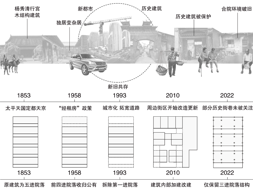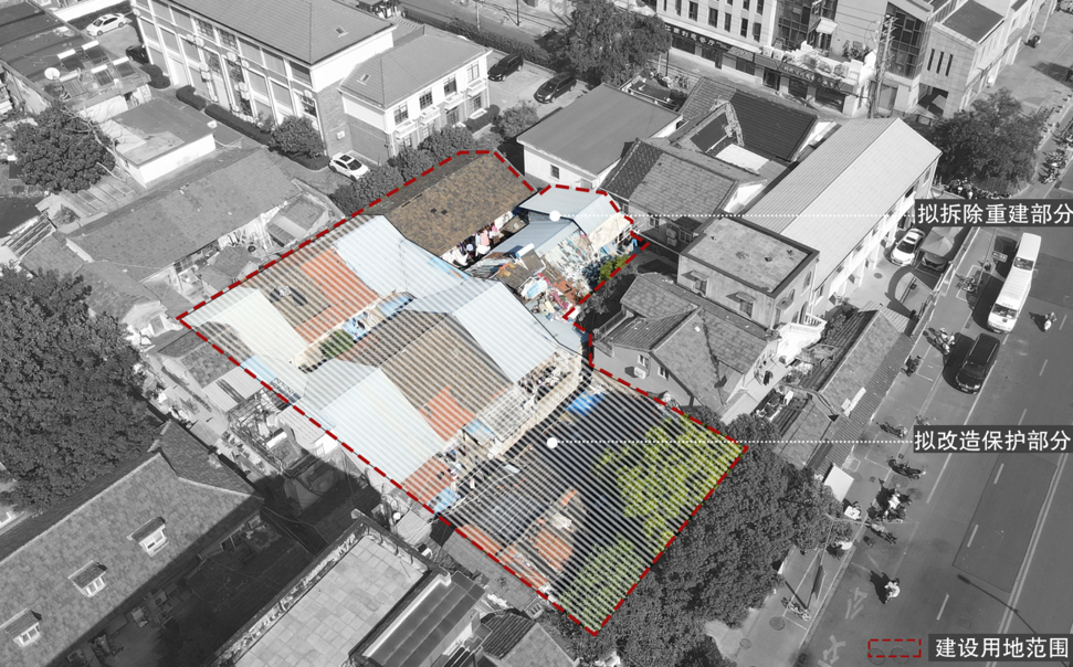 本次竞赛作品选址位于南京市秦淮区马道街161号,处于南京历史街区中。场地原建筑经历多次拆建加建,现仅保留三进院落,屋顶已损坏但木结构保存较好。总建筑面积为1400平方米,共有30户71人居住,大多为中老年夫妻或一家三口,有部分外来务工人员。建筑存在“居市之困”(活动空间缺乏)、“逼仄之苦”(人均居住面积远低于南京住房标准)、“一隅之衰”(建筑破坏严重及建筑内部舒适度较差)的问题。因此设计采用“低技、低干预、低成本、高能效”的绿色技术,保护历史建筑的文化价值,提升整体生活品质。