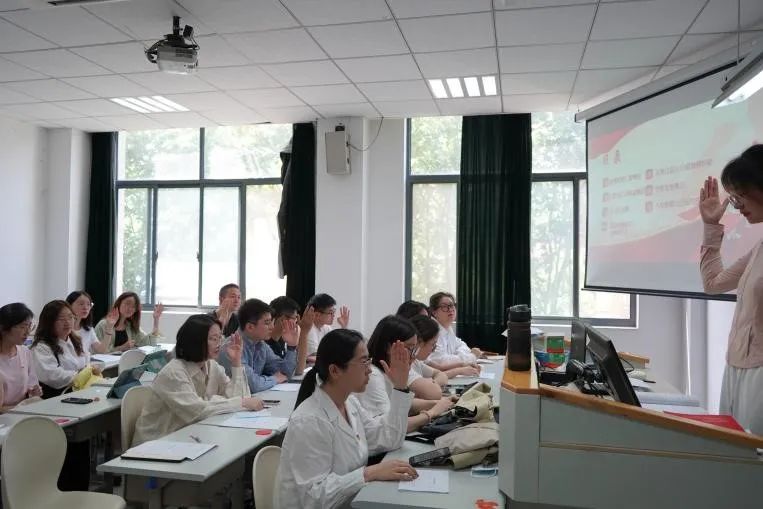 支部书记为新发展的党员佩戴上党徽。随后,在领誓人王思远同志的带领下,支部全体党员向着党旗宣誓:“我志愿加入中国共产党,拥护党的纲领,遵守党的章程,履行党员义务;执行党的决定,严守党的纪律,保守党的秘密,对党忠诚,积极工作,为共产主义奋斗终身,随时准备为党和人民牺牲一切,永不叛党。”