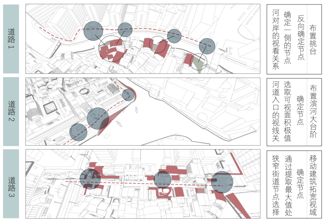 在设计的初期阶段,使用SDNA模拟分析基地内道路的通畅程度,使用视线模拟技术寻找关键节点,利用GIS数据库技术对场地进行综合评价,使用蚁群模拟寻找最优路径,采用光照模拟对建筑高度进行约束,或使用辐射模拟对构造进行优化。