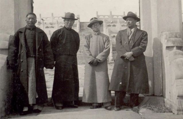 刘敦桢先生(左二),与梁思成先生(右二)等,合影于北平天坛圜丘内壝东门,1935年。