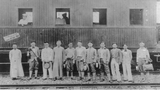加入营造学社前的刘敦桢(左四)率中央大学建筑系学生北上测绘古建筑,摄于浦口车站,1929年。
