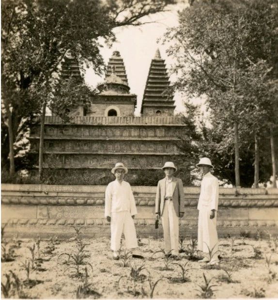 刘敦桢(右)、杨廷宝(中)与林是镇(左)在北平真觉寺金刚宝座塔勘察,1935年。
