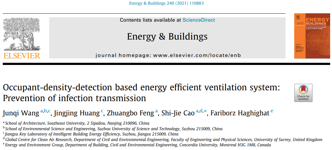 近日,好色tv 曹世杰教授团队发表的研究论文“Occupant-density-detection based energy efficient ventilation system: Prevention of infection transmission” “基于人员密度监测的高效节能通风系统:传播与感染防控”(第一作者王俊淇、通讯作者曹世杰),先后获国际SCI权威期刊《Energy and Buildings》近5年(2018-2022)最佳论文奖和2023年首届“江苏省自然科学百篇优秀学术成果论文”荣誉。