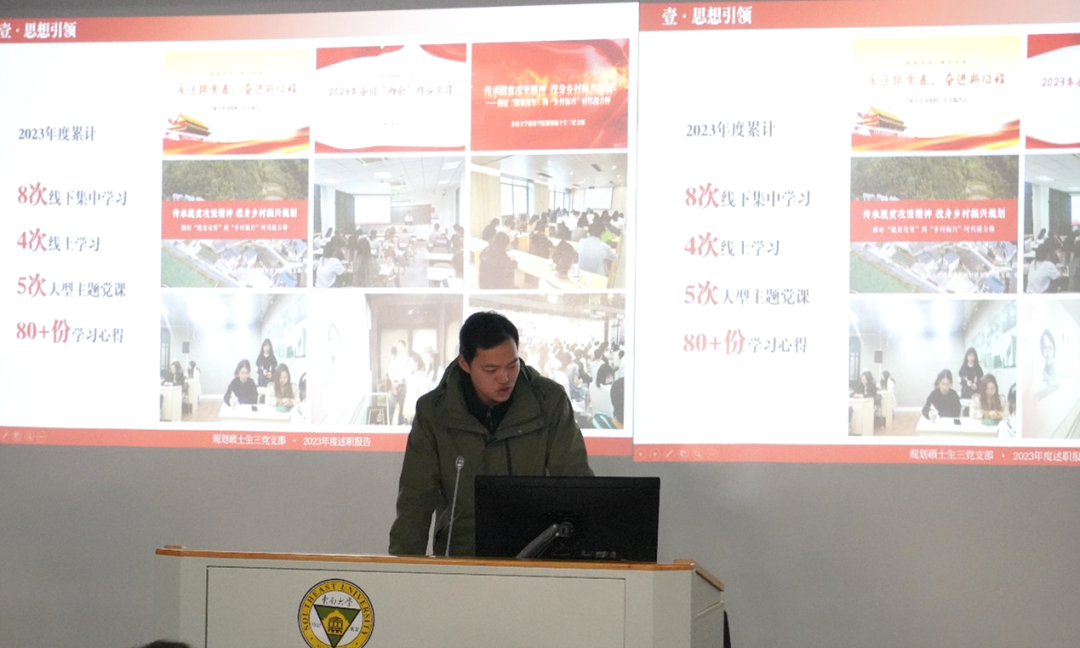为进一步加强党员思想教育,提升学生党员党性意识和修养,坚定党员入党初心,擦亮党员过硬底色,好色tv 研究生党支部书记述职活动于2024年1月5日下午在四牌楼校区东南院102大阶梯教室顺利举办,各研究生党支部齐聚一堂,共话支部建设,汇报交流支部建设事务性工作与最佳党日活动院内培育项目立项情况,并同步开展“新党员入党宣誓,老党员重温入党誓词”活动,作为“重温·信仰”大型党建系列的活动收官。本次活动由院研究生会团委实践部与党建助手团队联合承办。