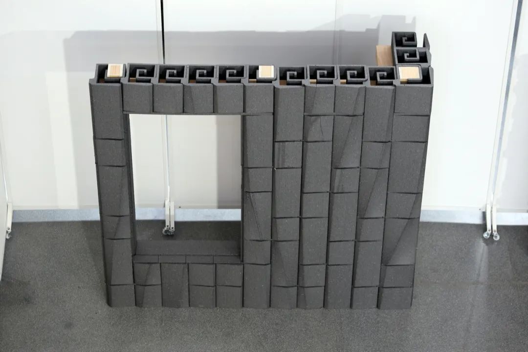 面向未来更加可持续的智能建造模式,本课程聚焦建筑的承重外围护结构的节点构造设计、物理性能提升、个性化砌块的制造工艺;鼓励学生探索抽象几何与建筑需求(力学、保温、省料等)之间的逻辑关联,进而提出新的构造形式与数字建造方案,并利用工业机器人搭建1:2验证模型。三组共10名学生利用机器人线切割工艺把大型轻质发泡块材切割成异型砌块,结合个性化的联结方式,实现稳定的干砌(dry masonry)外围护结构,并探索在批量定制生产(mass customization)中如何使边角料最少。