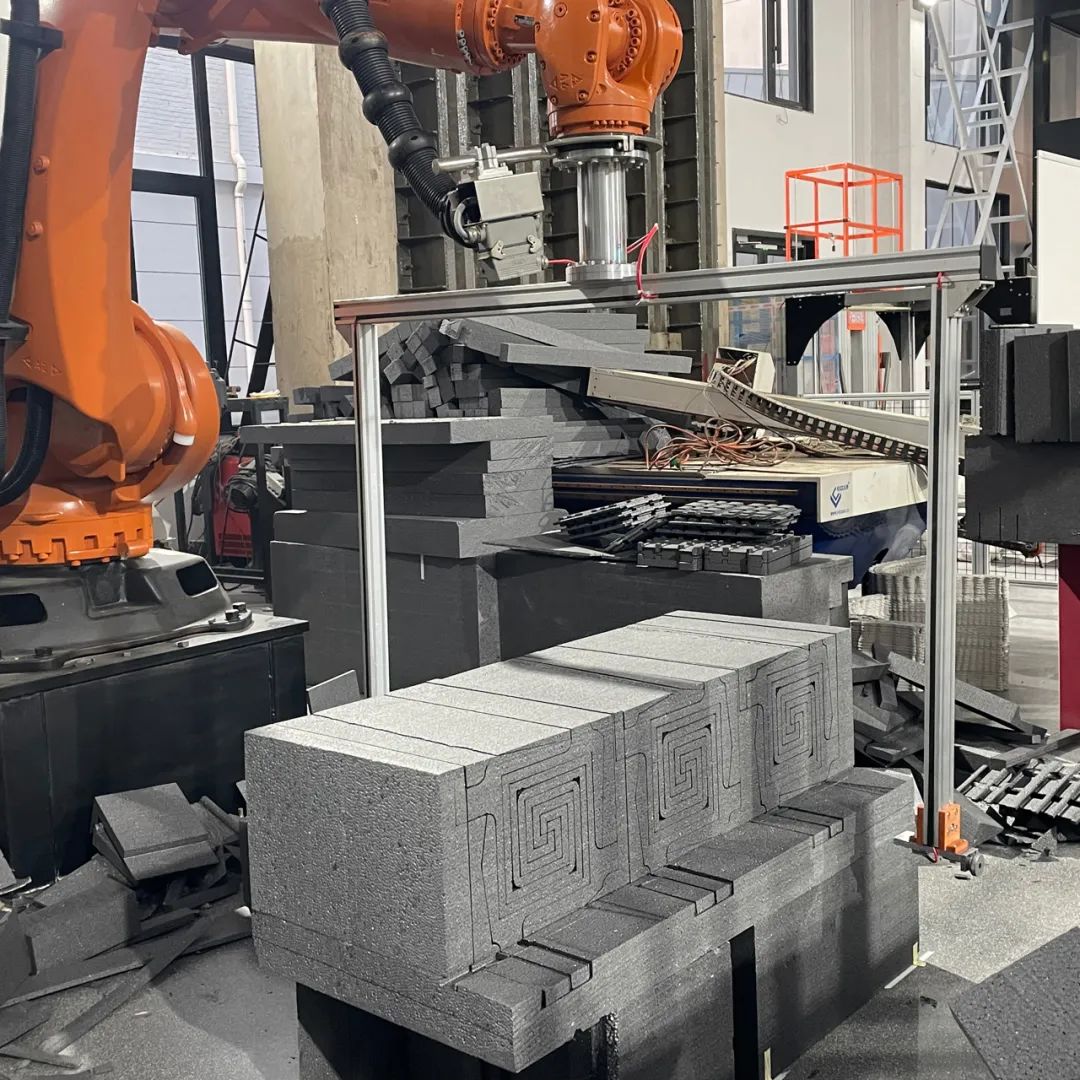 对3类砌块及其子类型(共21种)进行参数化建模,并密排在1.2*1.2*2.4m原材料方块中,以便于批量化线切割并使剩余的边角料最少。使用6轴工业机器人及其变位机实现各种不规则砌块的自动化制造。