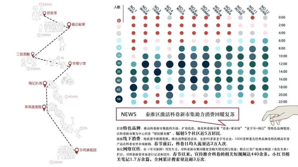 靠科巷一侧选取三姐酒酿、陶记扒鸡等这一类网红店铺作为点位,在靠生活街道菜摊、菜场和东西白菜园也选取了一些位置进行统计:可以看出科巷店铺人口峰值很高,但生活街道的位置人群活动的延续时间更长,在人群散去之后还有一些菜场运输、垃圾清运的行为。