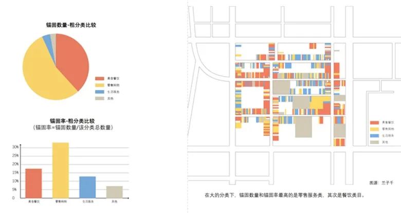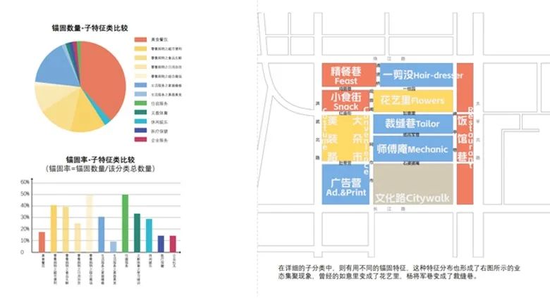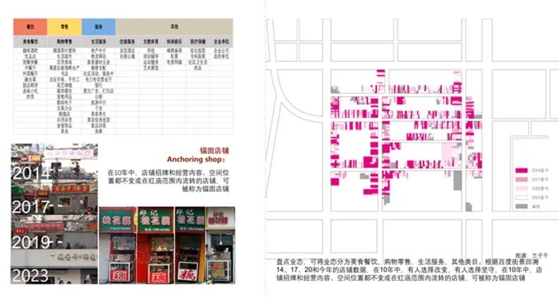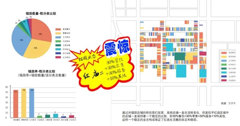经调研发现,红庙中的业态呈现出锚固的特征,迭代、更新的过程中保持稳定的业态占比为生产关系的建立、运营提供基础,并在店铺之间形成了良性互动的互补关系。