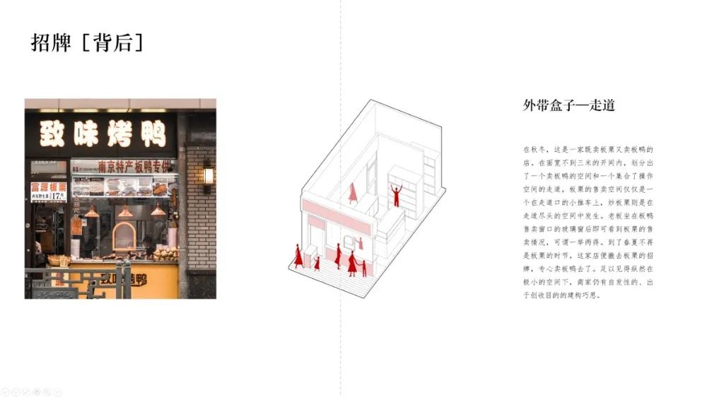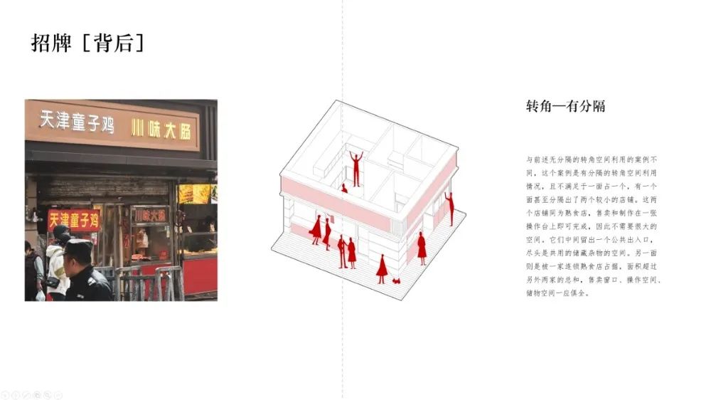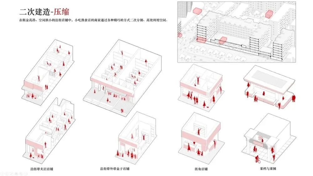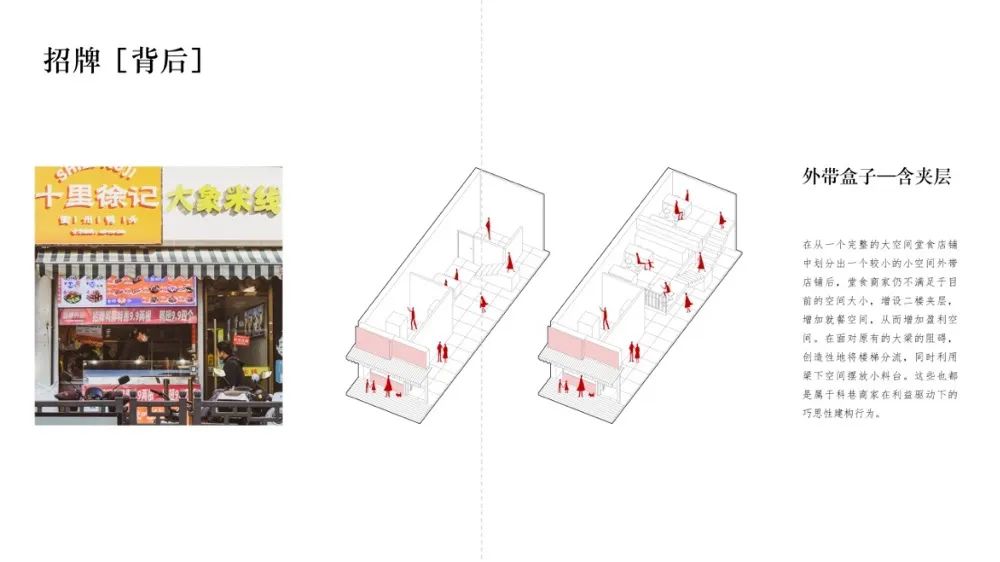 现在的店铺绝大多数已打造成了实体店铺、外卖平台、宣传平台流水线式的运转方式。同时越来越高的店铺租金也是造成店铺面宽越来越小的一大原因。再进一步放大,我们可以看到在租金高昂、空间狭小的沿街店铺中,商家通过各种精巧的方式二次分割、高效利用空间,体现出科巷极度压缩的空间特征与使用者的二次建造行为。