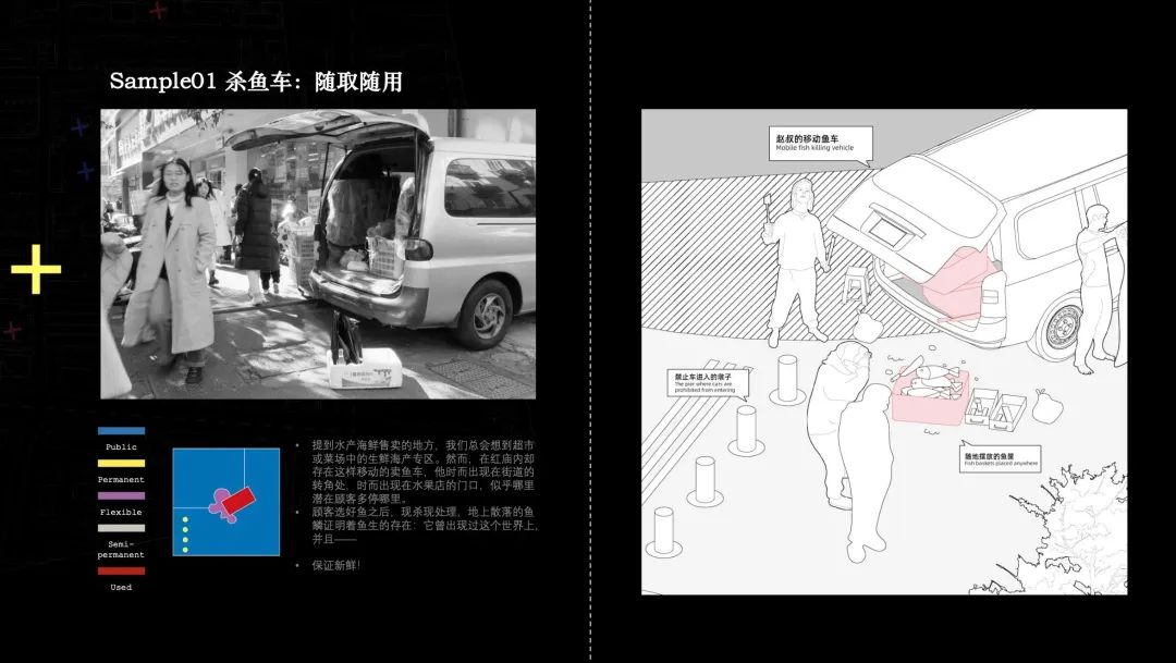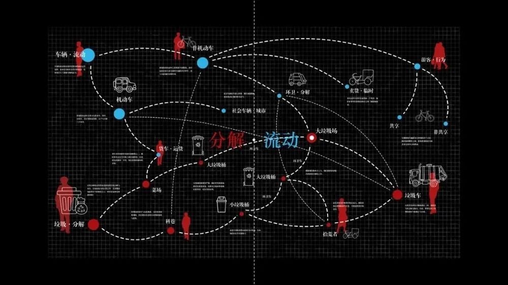 以车辆与垃圾桶为代表,梳理科巷本身的分解与流动秩序:车辆象征秩序的流动与发生,垃圾桶象征秩序的分解与重构,将其有效的梳理呈网状关系,简要示意其运作逻辑。