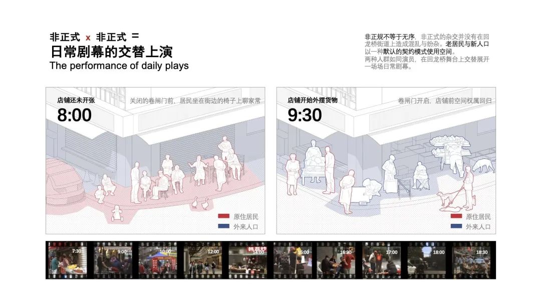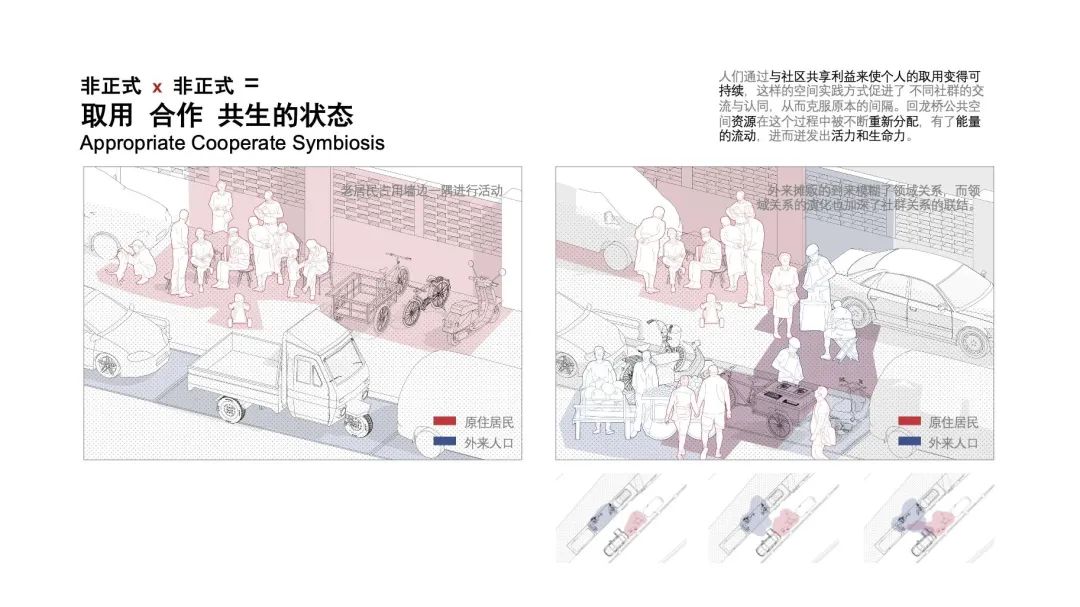 非正规不等于无序,非正式的杂交并没有在回龙桥街道上造成混乱与纷杂。老居民与新人口以一种默认的契约模式使用空间。人们通过与社区共享利益来使个人的取用变得可持续,这样的空间实践方式促进了不同社群的交流与认同,从而克服原本的间隔。