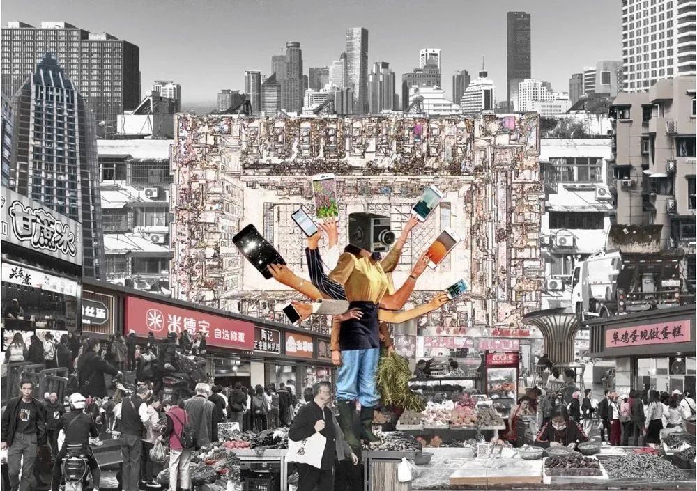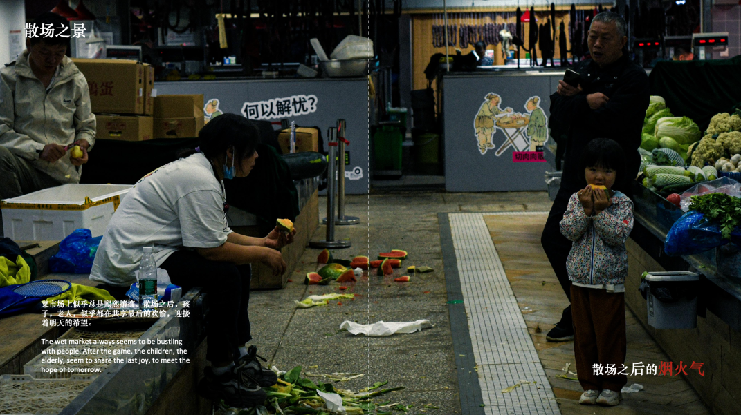 菜市场作为一个存在于熟人社会中承载社会互动发生的“场所”,如今被挤压,被规定在特定的区域,同时被打上“科巷新市集”的标语,以至于居民日常的买卖活动可以作为“展览”的一部分。同时原本一层的室内菜场退至二层,经历了智慧化、标准化的改造,以迎合现代都市景观。