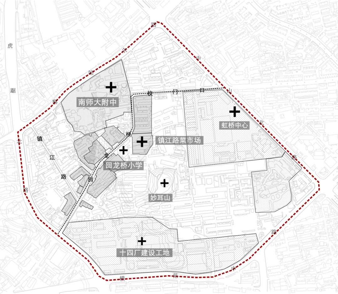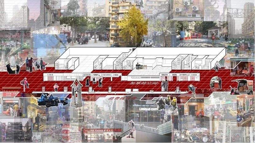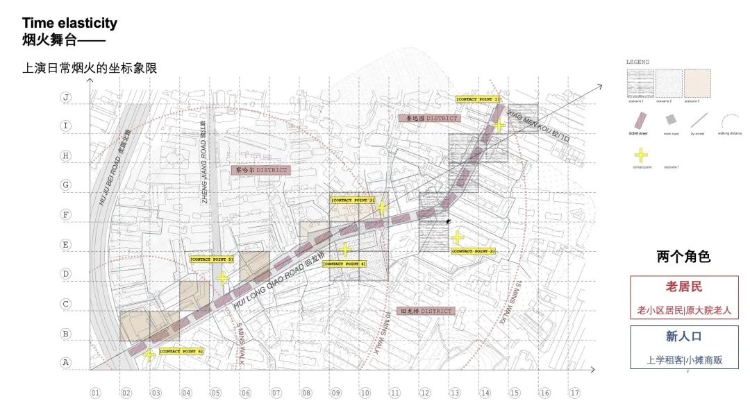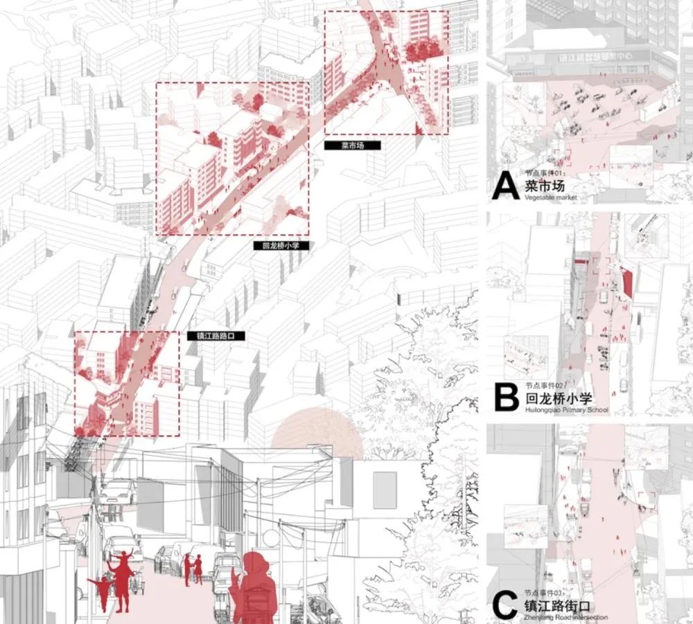 而在这片秩序里,三个异质性的节点(镇江路菜市场,回龙桥小学和镇江路街口)也形成了变奏。这三个节点空间在整体街道序列上起到串联和脉冲作用,且构建了许多美好的模式语言。