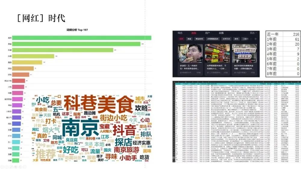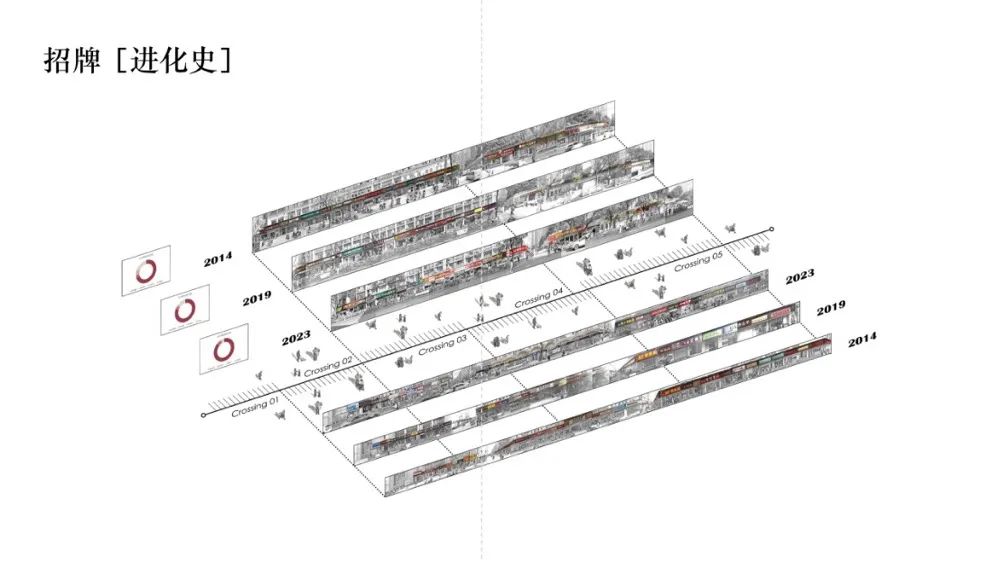 从2014年到现在的立面招牌变化可以看出,招牌之下的店铺面宽越来越小,招牌的色彩越来越鲜艳。这种变化的背后是网红时代、网红经济的推动作用,抖音、小红书等网络平台的流量使得探店成为一种营销手段。