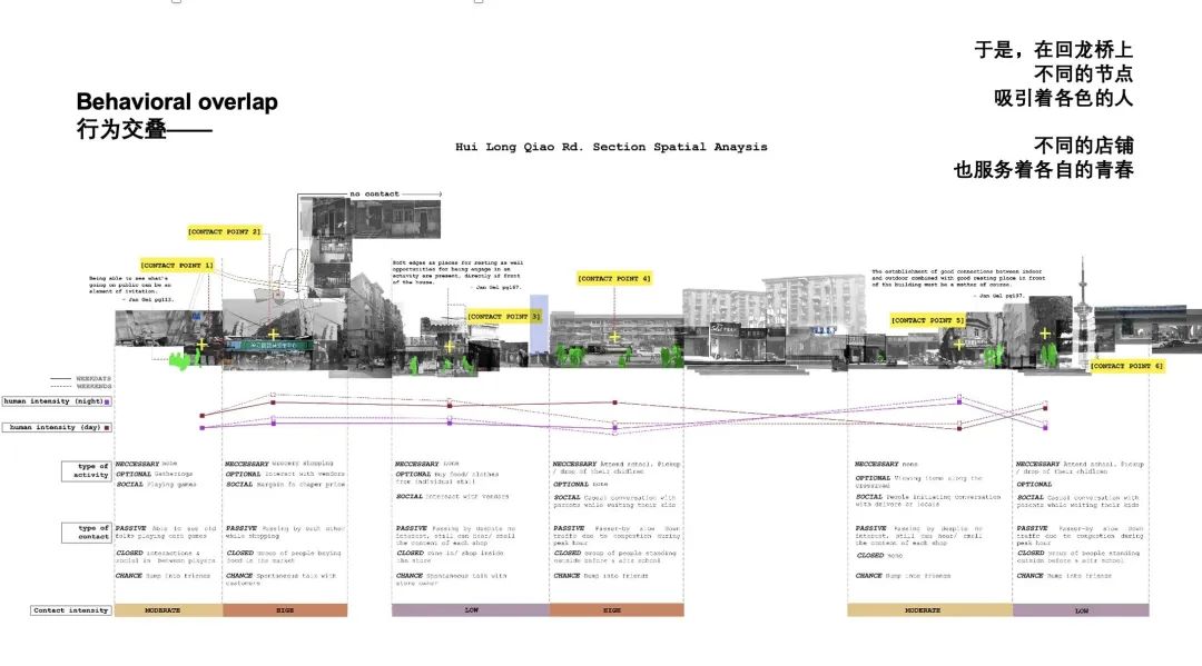 这座内向的城市孤岛中,回龙桥街道成了几个社区的夹缝运作的烟火,上演着不与外人道的公共居民生活。线性街道串联着各个社区,像叶脉一样,既串联这街道,也收纳着社区居民拥挤到街道上的公共生活。