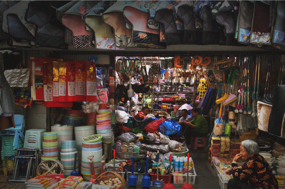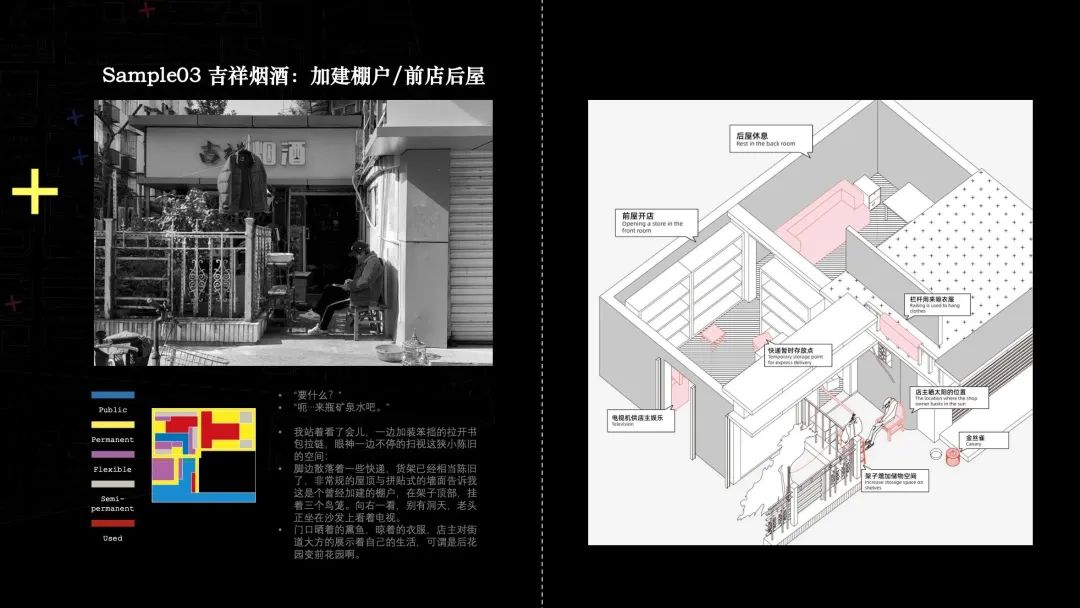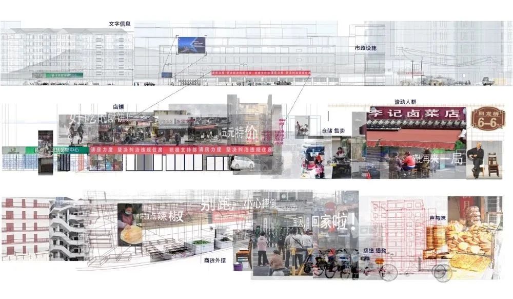 向内的居住性日常和向外的消费性日常在加厚的空间叠加在一起。移动的车辆、行人,堆放的东西,招牌,店铺的活动,居住的活动等等交织在一起,人们的需求转化为具体的空间再生产的行为,呈现出熙熙攘攘的热闹的烟火气。