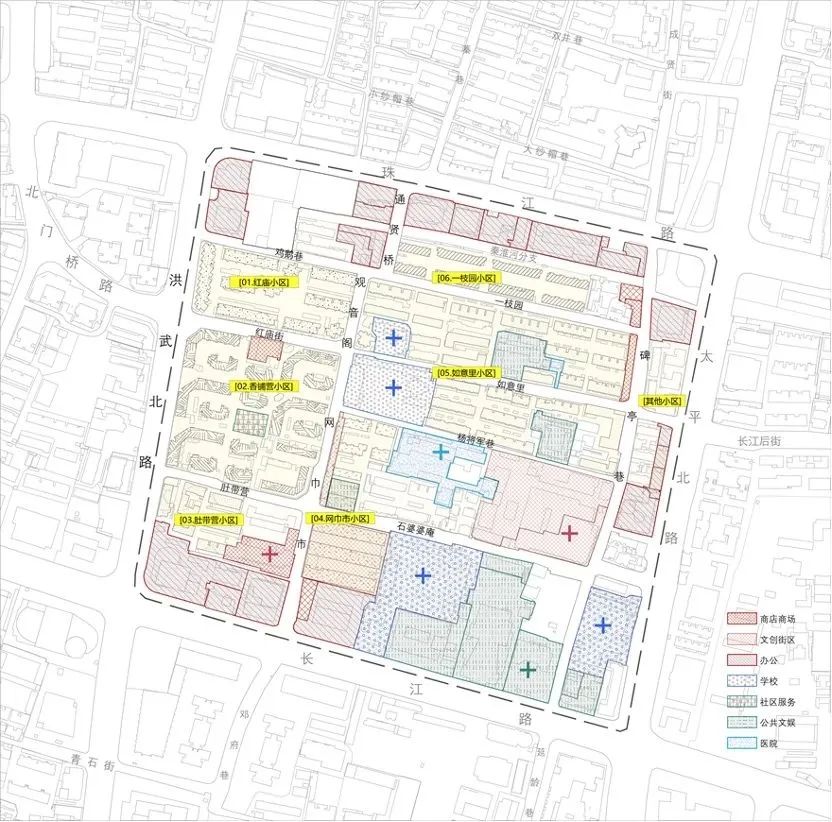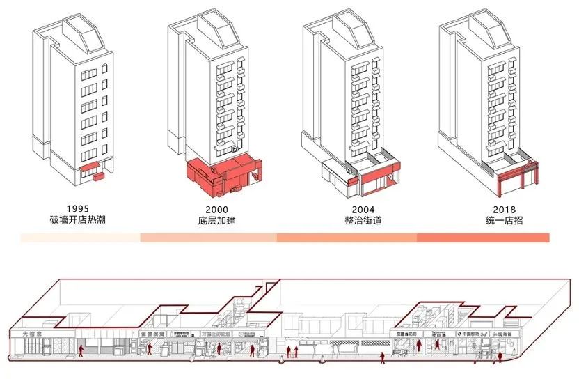 红庙片区的空间格局以红庙街、网巾市、鸡鹅巷、如意里等鸡鹅巷为骨架,自明清时期便形成了“居”与“市”的混合体。90年代初建成的多层住宅区在经历破墙开店和多次正规化改造之后逐渐形成当前较为稳定的空间格局。