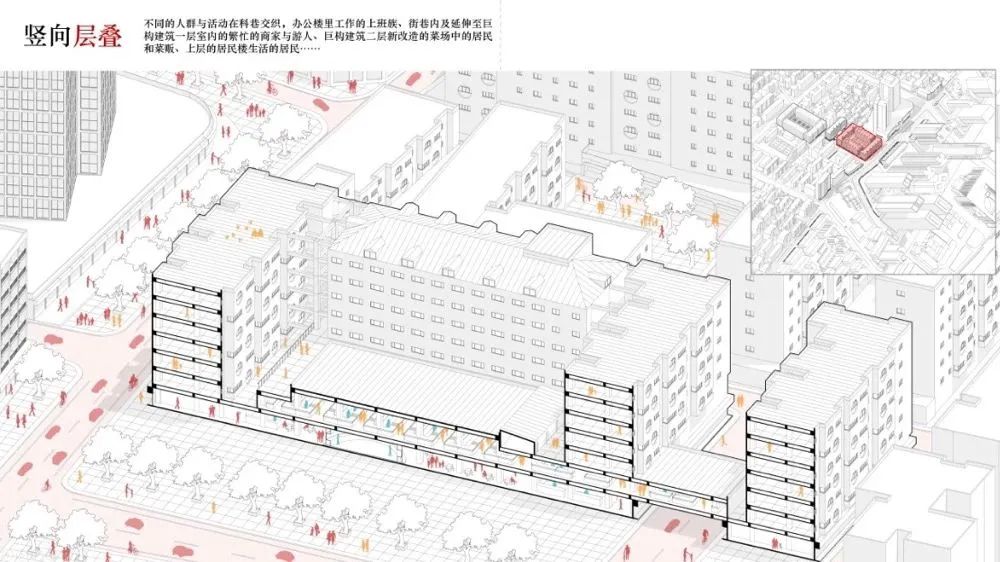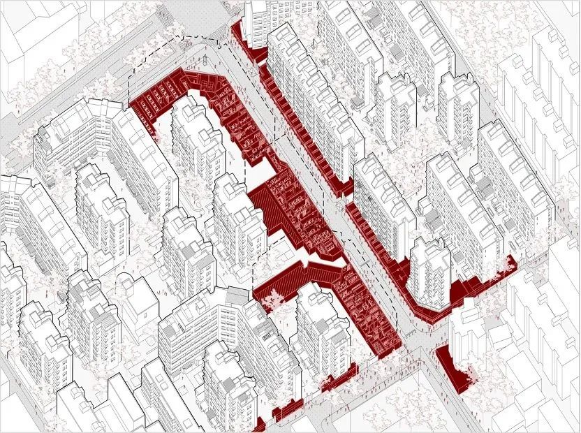 居住、中小学作为内里,公共商业、办公、文化场所包裹在外;多层级街巷形成细密的联通结构;由规划和自发建造的公共空间容纳了多样的活动。增加的空间像一块海绵吸纳了丰富的生活场景。