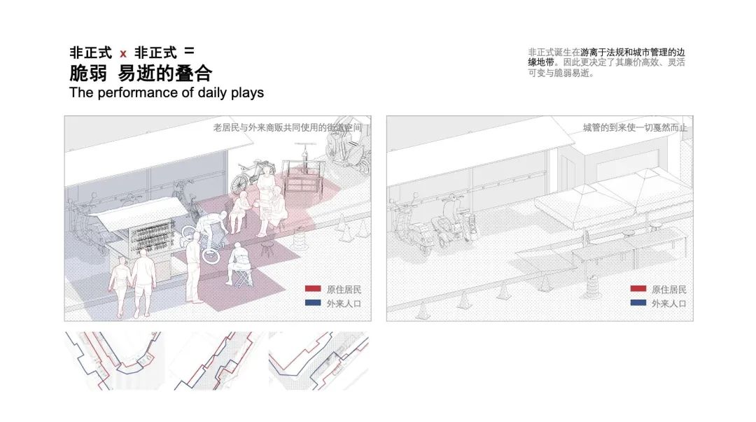 非正式诞生在游离于法规和城市管理的边缘地带。因此更决定了其廉价高效、灵活可变与脆弱易逝。