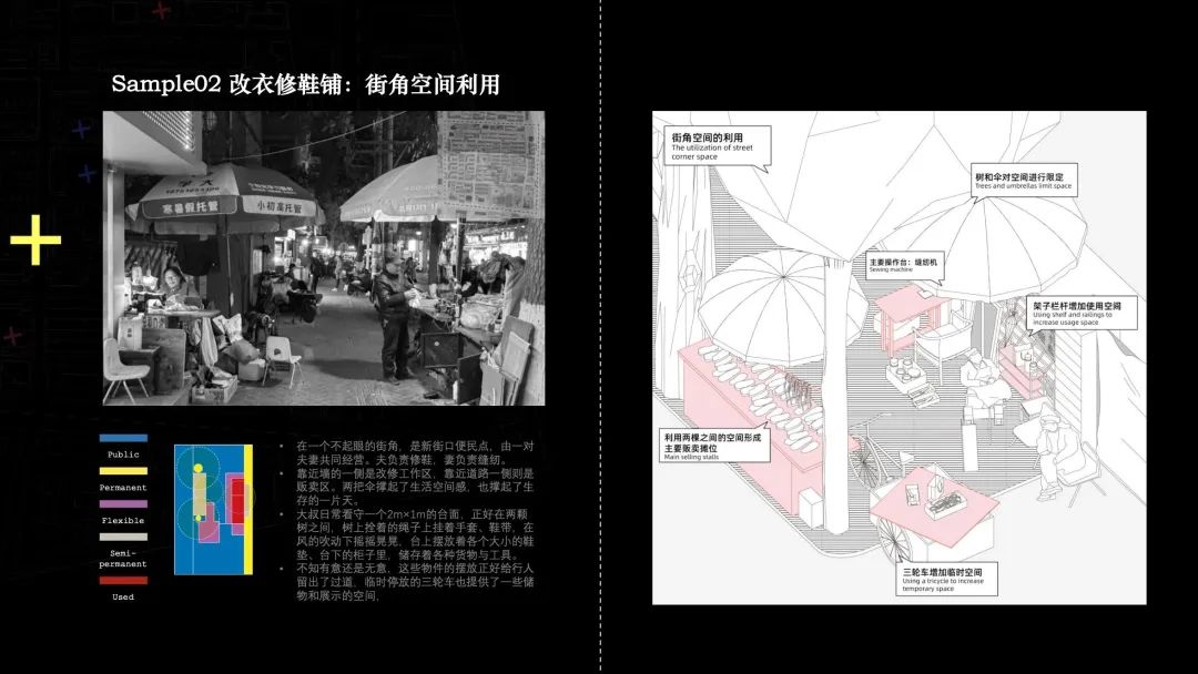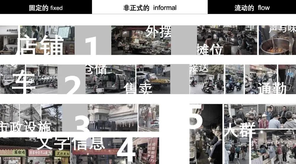 非正式(Informal) 成为人的行为与街道的一种高度和谐的 “关系 ”;也可以理解为从“混沌 ”里发现“秩序 ”的过程。随着管理制度的缺位,在这条街道上的烟火里,我们识别出这里生长的公共性活动,他们是非正式的存在,但也是最原真性的表露。