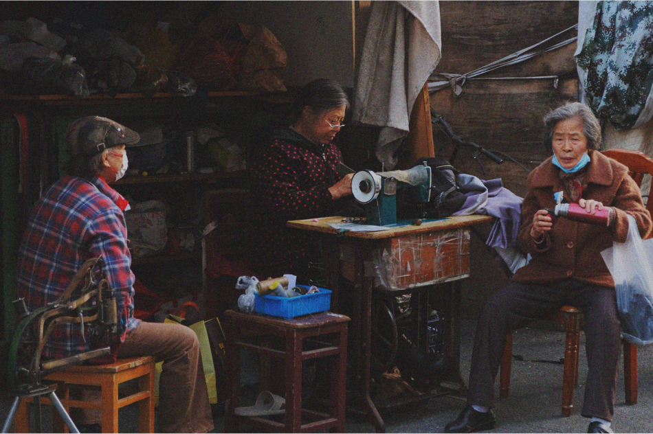 非正式的裁缝铺,临时的桌椅,一直流动的家长里短